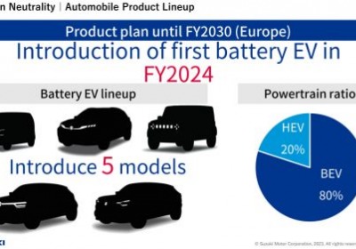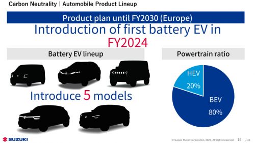 An electric Jimny would get the dinky 4x4 back to Europe without any classification trickery. The Japanese brand ended export of the regular four-seat model to Europe in 2020 when it could no longer pass EU emissions. It now sends the same model as a two-seat commercial vehicle. Suzuki sells as many as seven models in European markets not including the Jimny, six of them mild hybrids, one a plug-in hybrid. There have been rumors of a hybrid Jimny for a couple of years, and it's predicted the new five-door will get a hybrid option shortly. The investor presentation deck predicted an eventual powertrain ratio in Europe of 80% battery-electric vehicles, 20% hybrid vehicles. We expect that would mean a near overhaul of the European ranges with current models dropping out in favor of hybrids with electric options.