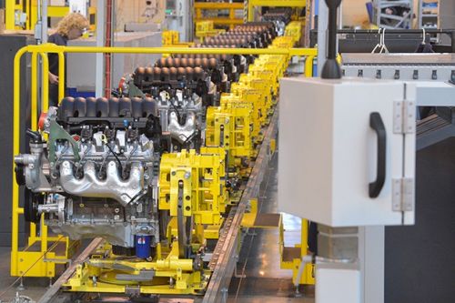 On one side of the factory, the arriving cast blocks and heads – there's no foundry at Tonawanda – go left-to-right, on the other side the cylinder head assembly goes right-to-left, and they meet in the middle at two lines where they are joined and the engine is finished.