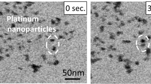 However, platinum is scarce and costly. Furthermore, as electricity is generated, platinum nanoparticles coarsen, thereby decreasing fuel cell output. In order to prevent coarsening and maintain catalytic performance, the behavior underlying the coarsening process must be identified. However, the minute scale of the platinum nanoparticles renders observation via conventional means difficult.