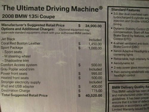 Up for sale is my 2008 BMW 135i. It currently has 60k miles on it. Black exterior with red leather interior. It is fully loaded with nearly every option except navigation. This is the first year of the 1-series and it is equipped with the rare n54 twin turbo 6-cylinder engine which is the same engine that was used in the 1M. Options include 6-speed manual transmission, m-sport package, comfort access keyless start, heated power seats, sunroof/moon roof, shadow line trim package, USB & iPod hookup, and more. This car has been tastefully and safely modified to produce over 400hp. No expenses were spared to make this 135i outperform an m3 while getting significantly better gas mileage. Over $5,000 has been invested to really set this car apart from the crowd. New performance clutch was just installed to handle the extra power. *Turbo's are covered under warranty for 8years or 82k miles. High Pressure Fuel Pump is covered for 10years or 120k miles. For more information on the car, feel free to contact me at (631) 258-3298. Extras. exterior Lightweight Breyton GTS-R wheels with Nitto NT-05 tires. Carbon fiber BMW performance rear spoiler Scopione carbon fiber front splitters tinted windows red pinstriping performance Burger Motorsports JB4 tune with usb mapping cable. also wired through steering wheel for controlling features/maps. Raceland downpipes Berk midpipe aFe stage 2 sealed cold air intake red RPI intake scoops Wagner upgraded larger intercooler ACT HD Clutch |