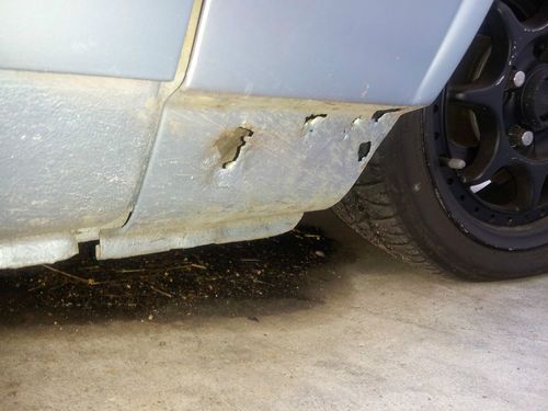 There is minor rust on the front two fenders in the usual location, the rear passenger side rocker panel also has some rust that appears to have been covered up with bondo in the past.