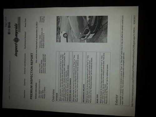 Excellent mechanical condition, but a few minor scratches to be 100% honest. Attached "Inspecct My Ride" report really inflates size and scope of dents and dings. Premium and Cold Weather packages. One owner with all service performed at local deal except for last oil change. Have all service records. Have all original sales materials, window sticker, etc. Buyer to arrange shipping. Payment by Certified Bank check only. Once Check Clears I will send title and allow you to arrange delivery.