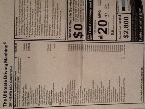 Purchased brand new in Jan 2014 original owner in Mint condition ! BMW 650i black top convertible color is a beautiful Deep Sea Metallic Blue. Completely loaded with single upgrade. Comes with Platinum extended warranty plan that was purchased for $4380.00 all comes free with the purchase of this car. It is the M Sport Edition and comes equipped with the M Sport Package . There is a picture of the original sticker that lists the original price and all that the car is equipped with.