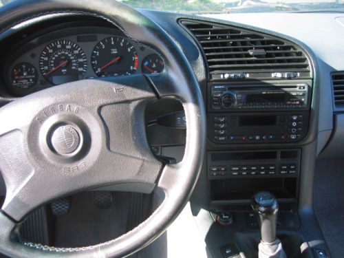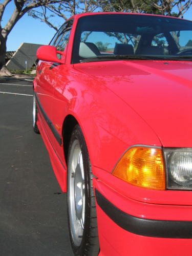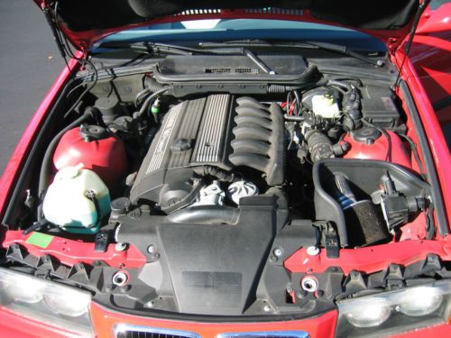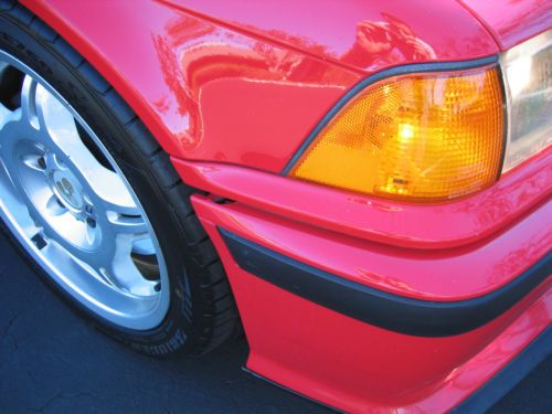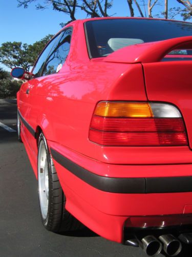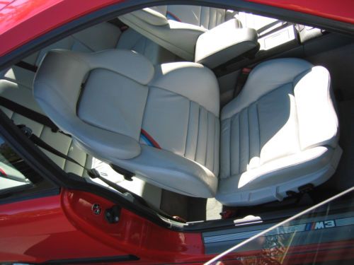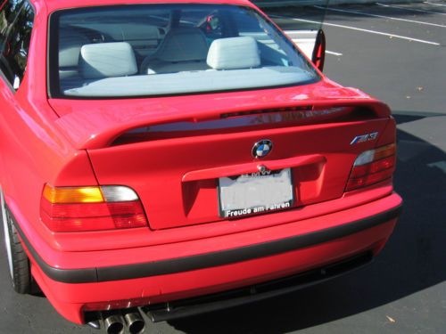 1998 BMW E36 M3 Coupe. Bright Red (Hellrot) with two-tone light gray leather interior. 52,478 miles. 5-speed manual. Dual power Sport Seats (Vaders) and sport interior, BMW Motorsport-2 forged aluminum wheels(option) 2nd owner, purchased with ~32k miles. Originally a Florida car, and bought from Lamborghini of Chicago in January 2003. She was brought home and garaged until spring. She's been my summer toy, very lightly used since I've come to own her. In the 10 years I've owned her, She has only been driven in the summer ( NO snow or road salt exposure of *any* kind, ever!) and always garaged. Because she has been garaged daily, and off the road from October to April every year that I've owned her, the mileage is low, and there is no rust of any kind, and the interior is in exceptional condition for a car this vintage. Mechanically, the car is perfect, complete, and unmolested. Everything works. I have 2 sets of keys including an OEM illuminated key, a valet key, and a remote. I have the factory manuals, and complete tool kit and jack tools for the car to be included upon sale. I even have the rare factory BMW cargo net that will be included. The floor mats are WeatherTech units for front and back in gray rubber.