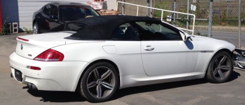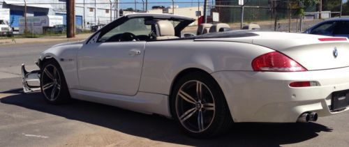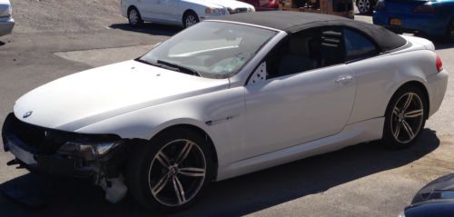 You are bidding on 2008 BMW M6 white convertible low miles 23k with 500 horsepower. The car was in a minor front end accident. No structure damage was done. only drivers air bag headlight and drivers mirror is needed and a few minor items. The car does run and drive all suspension is great. Top has no rips tears and does operate.