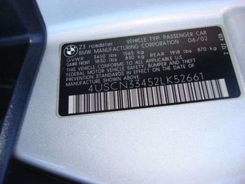 Immaculate 2002 BMW Z-3, 2.5 is being offered for sale; this is a one owner, 15,700 original miles, clear title car. I bought new from Otto's BMW in West Chester, Pa. It has been garage kept, mature driver, no track time, non smoker, no kids or pets. Has only been in rain twice, only driven in spring and summer months, usually top down. always hand washed, hand dried, and detailed weekly. This car shows like new. its as close to perfect as you'll find for its vintage. The car has the Sports "M" package, Premuim Package, power top, power drivers seats, power mirrors, heated seats, power windows, cruise control, CD/AM/FM radio, power door locks & keys. Engine compartment is completly clean. always dusted, but never wet or grimey. wheel wells are clean, always cleaned after each days drives. clean wheels, no curb damage. (left front wheel has a small chip from torque wrench durring rotation) All rubber seals have been treated with presevitive twice a year since new.. no tears or rips. Leather seats have been cleaned and conditioned twice a year since new. All vynile has been cleaned and conditioned twice a year since new. (no silicone based products have ever been used, inside or out) Good condition floor mats have kept the original carpet in perfect condiion. Seats are a 9/10... all stitching is in tact, bolstering is perfect and in original sahe with great support. Dash is clean and no cracking.. center console is perfect, no cracking. Shift boot is perfect. This car has never been hit..no damage history, repaired, worked on or modified. BMW maintained at Ottos BMW, West Chester, PA. All servises are complete.. will be sure all are currnet before delivery to buyer. The power top is in excelent condition. little to no fading .. (car never sat outside with top up.. never in weather, no chemicals or soap used on top) rear plastic window is about an 8/10. has been maintained with aircraft grade plastice cleaner, but has some very minor hazing, but in good condition and is transparent. Body and paint is in exceptional condition. absolutley no dents or dings or scratches on this car. one very minor blemish, (not a chip) on the windshield.. two very small stone chips on front bumper, one very small chip on front of hood. All are extreemly minor... i only mention for full disclosure. No paint or body issues on fenders, door runners or around wheel wells. Original tires. good condition, left rear;6/32, right rear;5/32, left front; 8/32 and right front; 7/32. Brakes all good. Will also include two BMW car covers and one BMW battery maintanier |