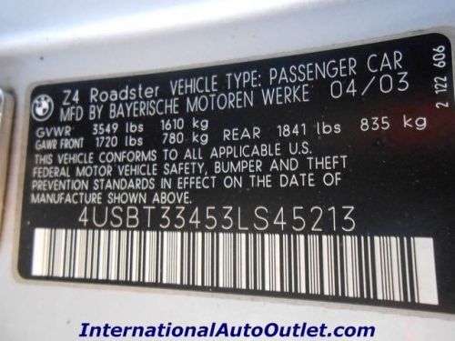 2003 BMW Z4 2.5i--IMMACULATE--TWO TONE LEATHER INTERIOR--POWER OPTIONS--EXTRA CLEAN--A MUST SEE TO APPRECIATE--MOST OF OUR VEHICLES ARE HIGH QUALITY, HAND PICKED, ONE OWNER IN A LIKE NEW CONDITION WITH A CLEAN CAR FAX. ALL ARE FULLY INSPECTED, SERVICED AND RECONDITIONED, THOSE THAT DO NOT MEET OUR MECHANICAL CRITERIA ARE NOT OFFERED FOR SALE. MOST OF OUR VEHICLES ARE COVERED WITH THE MANUFACTURER WARRANTY OR A 3 MONTHS/4500 MILE WARRANTY. FINANCING IS AVAILABLE AND TRADES ARE ALWAYS WELCOMED. FOR SIMILAR GREAT DEALS PLEASE VISIT OUR WEBSITE http://www.InternationalAutoOutlet.com At International Auto Outlet, we take pride in maintaining a large selection of fully reconditioned, inspected, certified vehicles. With over 200 quality certified cars, vans, and trucks from local dealer trades, overstocked inventory, off-lease manufacturer auctions, bank repossessions & open auctions, we have the perfect vehicle for you- and your budget. Call, email or visit our website today.