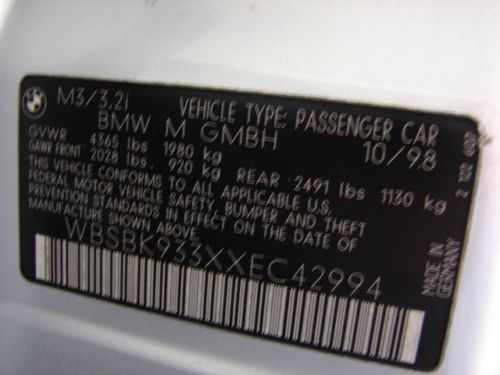 Thanks for looking at my auction. I have for sale a 1999 E36 M3 with no modifications done to it. The car is 100% stock and drives like new. The car has been garage kept it's whole life. I'm the second owner and have owned the car for almost 10 years. The car has been very well maintained. The car has only been serviced with the very best parts, Mobile 1 oil changes every 3,000 miles. I have only driven the car when the weather was nice outside. The car just had a full brake change including new rotors and full service. Tires also have a lot of tread left in them. Full size spare is also in the trunk.