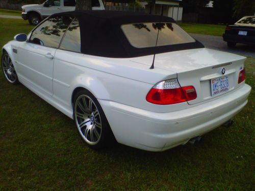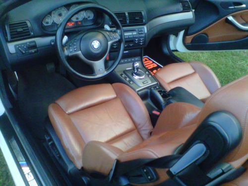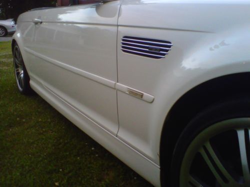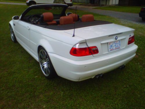 For sale is a 2003 BMW M3 Convertible. 108,xxx Miles. Hard-to-find white/cinnamon color scheme. -SMG 6 Spd w/ paddle shifters -Brand new tires -Recently passed NC safety inspection -Excellent condition -Convertible works great/ no holes or leaks -3.2L 333bhp -Super clean in and out -Cold weather package -Heated and power seats -Radio/cd work great -35%tint in front windows -5% on convertible window -18-19mpg city/25-26mpg highway -multi-window button is split, but works -front emblem shows wear -two wheels have curb rash -check engine light is on for code P-0133 (oxygen sensor slow circuit) -tire pressure sensor monitor light is on. No tires are flat; BMW mentioned this is usually cause from a dead battery in a tire sensor -currently has loan so will take 2-3 days to release title after payoff, longer for out-of-state -no trades |