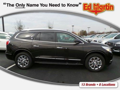 One look at the 2014 Buick Enclave, and you will realize it is a sight to behold. Its prominently featured black chrome waterfall grille and LED-infpre-owned head and tail lamps showcase its modern design. Together they add up to an impressive look for Buick's flagship crossover. Rich interior colors, ambient blue lighting, tri-zone climate controls, three rows of first-class seating provide room for 8, and QuietTuning technology creates a more comfortable environment that makes your driving experience better than ever. Working effortlessly with the updated 6-speed transmission, Enclave's 288-hp 3.6L V6 engine gives a powerful performance through direct injection and Variable Valve Timing. Dual Flow Dampers in the suspension system minimize impact and help reduce noise and vibrations from every road surface. Together, these technologies deliver an unparalleled drive that's controlled, quiet and efficient. The available Intelligent AWD system in this luxury crossover is always one step ahead. Constantly monitoring the traction of all four wheels, it kicks in automatically in the toughest road conditions. When the road calls, answer hands-free. From IntelliLink voice-controlled connectivity, to Bluetooth to the built-in Color Touch Radio, the finest luxury crossover wouldn't be complete without the latest innovations. Also standard is ultrasonic rear park assist which will alert you when you're getting too close to an object or structure. The industry's first front center air bag is at the forefront of Enclave's safety innovations. Together with its already robust list of safety advancements, like available Side Blind Zone Alert with Cross Traffic Alert and standard StabiliTrak with Traction Control, the new Enclave keeps you and your passengers safe, comfortable, and ready for the road.ENGINE 3.6L VARIABLE VALVE TIMING V6 WITH SIDI (SPARK IGNITION DIRECT INJECTION) DOHC (288 hp [214.7 kW] @ 6300 rpm 270 lb-ft of torque [364.5 N-m] @ 3400 rpm) (STD), LPO HIT THE ROAD Pricing includes destination, optional equipment and reflects manufacturer incentives. We pride ourselves in having an upfront, completely transparent purchase process. Nothing hidden and no surprises! Our goal, to create an automotive buying experience that will last a lifetime. Our hope, you will share your Ed Martin Experience with others. Sincerely, Ric McCoy General Manager