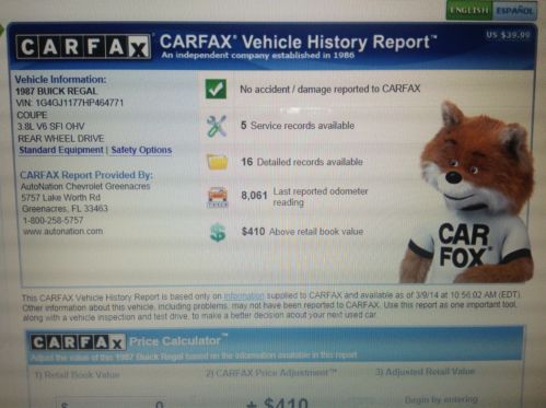 1987 Buick Grand National with 8801 for miles have record that prove the mile's. The wheels are Boyd Coddington wheels 20/8 fronts and 20/10 rears. The body on the car is laser straight, The odometer reading on auto check from 01/26/2005 was fat-fingered it was suppose to read 7382 but they added 10 in front of it by mistake. I did fix the issue through DMV and Carfax .The title does state the actual miles on it. If you take a look at the Ohio title on 9/23/2003 it had 7280 and then in 2005 DMV added a 10 in front of actual MILES by mistake and I had it corrected by DMV and the title was reissued with the correct miles.If you click on corrected Title Record on AutoCheck you will see where it state DMV as issued a corrected Title. The interior has no signs of wear and tear and no sign's of discoloration, like new. I also have all the orignal parts that came off the car except the Exhaust. ITEMS INSTALLED 1.ALKY INJECTION SYSTEM / TURBO TWEAK 60 PSI INJECTORS AND ALKY CHIP 2. SUMMIT CHROME ALTERNATOR 3. GN1 3'' CAT BAC DUAL EXHAUST 4.THE RIGHT STUFF BRAKE DISC CONVERSION 5. CASPER AUDIBLE KNOCK SENSOR 6. TURBO TWEAK TT340 FUEL PUMP 7. GN1 INTERCOOLER 8. GBODY PARTS 3'' DOWNPIPE 9.RJC PULLY'S 10.BOYD CODDINGTON WHEELS I KNOW I LEFT OUT OTHER STUFF PLEASE FEEL FREE TO CALL ME DAVID 561-291-4478 |