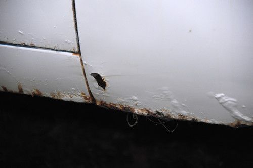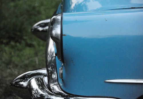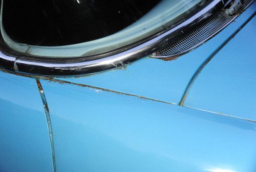Next to the fenders, short cracks on each side of hood on the foldover sheet metal which shows on top edge on hood on each side across from hood ornament. The word "Special" on the passenger side is two pieces and paint scrape with surface rust there.