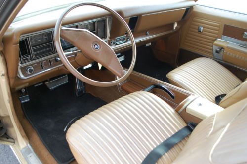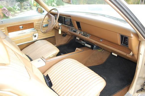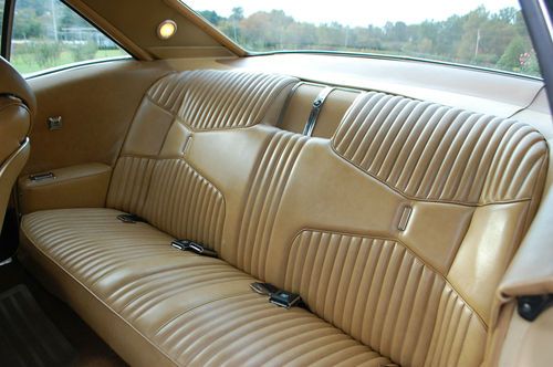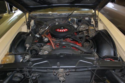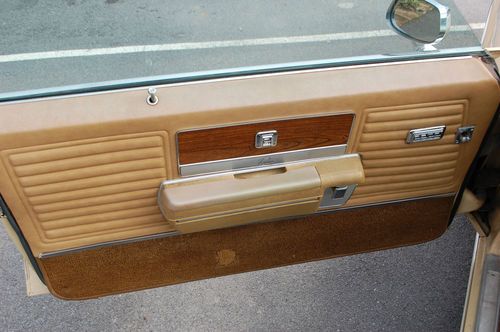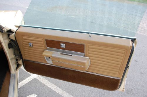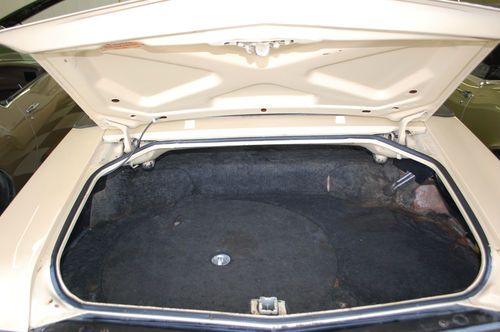 Documents show the car being repainted in 1976. It was repainted in a tan color. This was a color change from the original dark gold. Typical paint job for the times. Not a show quality job but still shines and looks good enough for people to say it's a beauty. A couple dings, scratches and touch ups. Only way I would repaint this car if I was going to make a show car out of it. It appears to have never had body work anywhere and by now if it had any serious rust it would be showing signs. Still has the original vinyl top that is in surprisingly good shape for the age of the car. Notice the short rear fender skirts. These are rare and look much better than long ones. Overall this body/paint/top is in good shape and in good driver condition. Chrome is original. Not show quality but no rust or bad pits. Like the paint, I would not rechrome anything unless I was making an all out show car. All glass appears to be original. Floors and trunk pan look good. Trunk is solid. Original jack/wrench and wheel with old tire. Original carpet/cardboard that's a little worn.