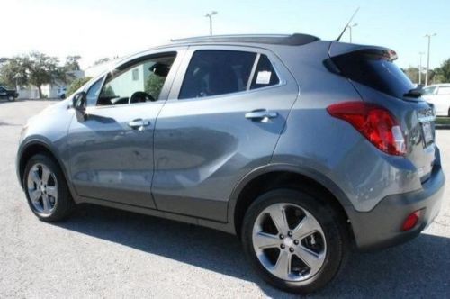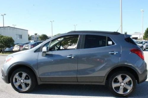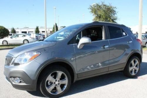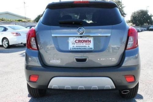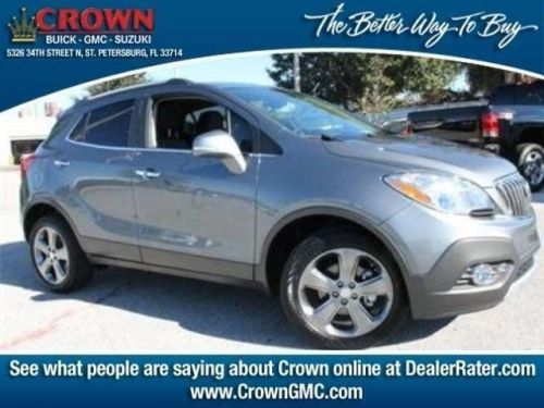 , Before Discount:$30,705.00, Dealer Discount:($1,268.00), Cash Incentive:($500.00), Special Discount:($500.00), Internet Price:$28,437.00, Total Savings:($2,268.00)!ALL WHEEL DRIVE, BACK-UP CAMERA, BLIND SPOT MONITOR, BLUETOOTH, MP3 Player, KEYLESS ENTRY, 30 MPG, SAT RADIO, TURBOCHARGED, You might not expect a 5-passenger crossover to be as finely crafted as a Swiss watch, as tech-savvy as your dream entertainment center and agile enough to maneuver through any narrow city street, but from now on you will. Introducing Encore, the luxury crossover with premium materials, ingenious design, flexible storage (up to 48.4 cu. ft.) and purposeful technology (such as active noise cancellation and an optional heated steering wheel). It's like Buick knew exactly what you were missing in a crossover, and created the versatile Encore for you. When it comes to design, the 2014 Buick Encore is one of a kind. It's sculpted, elegant, nimble, efficient and luxurious, all at the same time. Encore will turn heads with its chrome waterfall grille, chrome accents, portholes, and tri-shield emblem. Jewel-like translucent projector-beam headlamps contribute to the beautiful and elegant exterior. 18"" chrome wheels optional and 18"" aluminum wheels come standard. Your entertainment and navigation choices are simple, purposeful and empowering???the way personal luxury should be. The Buick IntelliLink system will leave you speechless???the instant you talk to it. It's a voice-activated, high-definition system that connects your smartphone, your Pandora and SiriusXM stations, and Stitcher SmartRadio, all through one 7-inch full-color screen. At the heart of Encore's power is a 1.4L ECOTEC 138-hp turbocharged engine with variable valve timing. For even more peace of mind, the all-wheel drive options seamlessly shifts power to Encore's rear wheels when more is required for better traction and handling. Designing a luxury crossover with you in mind means that Buick started with safety, and Encore takes safety to a whole new level with 10 air bags standard and available features such as Forward Collision Alert, Lane Departure Warning and all-wheel drive. These technologies combined with great Buick standards like StabiliTrak and OnStar, give Encore a comprehensive safety story. Crown Automotive Group serving Tampa Bay Florida offers great low prices, rebates and incentives for new Group & used Group cars, vans and SUVs to all of our neighbors in St. Petersburg, Largo, Clearwater, and Pinellas Park. Our Expert Service & Parts staff assist our Florida customers keep their Group vehicles in great shape.