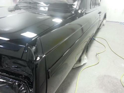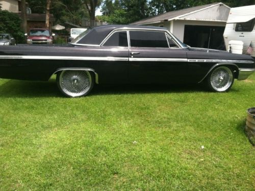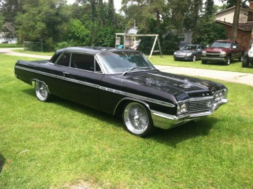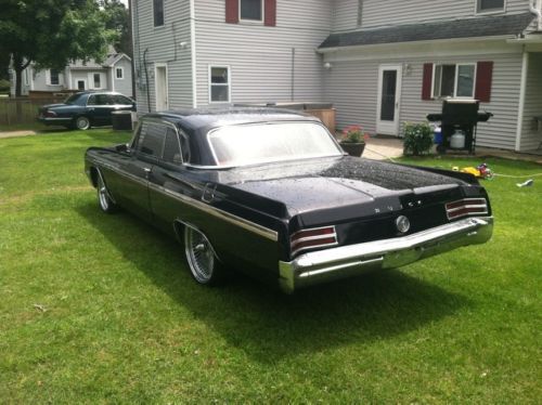 Freshly painted gloss black with red flake 1964 Buick LeSabre Sport Coupe with the original 300 all aluminum V8 block and heads with a 4 barrel carburetor with a turbo 400 transmission. This car is fully drivable. The body and the underside is very clean and solid. The quarter panels, Front fenders, inner fender wells,trunk, floor pans and hood are original solid and rust free. All the glass original. Both doors have minor fill on the bottom side of them. The interior is all original with factory air conditioner. The air conditioner is currently not working. It was just repainted 2 months ago with original bumpers and trim, is missing two LeSabre badges on back fenders and missing the "I" in Buick on the hood. It has 22' wire rims and tires on back and 20" on the front. |