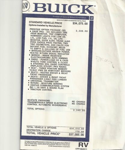 Options: Battery Rundown protection, 4 Wheel disc Anti lock brakes, Suspension Auto Level Control, 16 inch Aluminum Wheels, Climate Control Auto Dual Zone, Air Filtration System, Electric Rear Window Defogger, Leather Interior, Mirrors Power Fold away, Lighted Visor Vanity, Radio Cassette with Steering Wheel controls, Rear Seat Pass through, 10 way power Driver and Right Front Passenger, Speakers Concert Sound II, Trunk Release electric with security, Option Package SE, Gage Package, Outside Mirrors heated with Turn signals, Auto Dimming Rearview Mirror, Radio - Power Load CD, 3 Position Memory 10-Way with Memory Mirrors, Heated Driver and Front Passenger seats, Driver & Front Passenger PWR Lumbar, Cassette Player, Leather Seats, CD Player