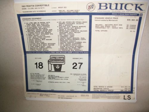 many mechanical parts, advanced electronics, and interior furnishings. The Reatta sported its own unique body style and was crafted with an attention to hand finishing uncommon for a mass-produced automobile. The assembly was performed at a small series of craft stations - each with a specialized team of workers, rather than a conventional assembly line. After a team had completed their portion of the assembly, the car would be moved by robots to the next station in the series. All of the paintwork was subcontracted to PPG Industries personnel - who performed the work on site. Every Reatta included a leather book containing the owner's manual and pen. In 1990 and 1991, a zippered owner’s folio was included. In addition to the owner’s manual, it also contained a "Craftsman's Log" with the signatures of the supervisors for the assembly of the car at the various craft stations.These slightly unusual items were an attempt to sell the mass-produced car as one built with individual care. This auction includes this owner’s folio. Also included is the original window sticker and a brochure for 1991 Buick cars and a CD about the Buick Reatta. This car was 1 of only 305 convertibles manufactured during the last year of production for the Reatta. This car comes from a smoke-free home and has been kept covered, in a garage. In my honest opinion, this car would satisfy any collector or someone looking for a new car. This car is being sold, as is, without a warranty. Shipping (both arranging and cost) is the responsibility of the Buyer. Local pickup is available. Upon completion of the auction, a deposit of $500 is due within 2 business days. Remainder of the purchase price is due within 7 days from close of auction. If you have any questions or need any additional information, please feel free to contact us. |