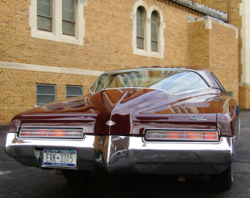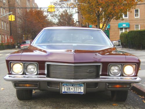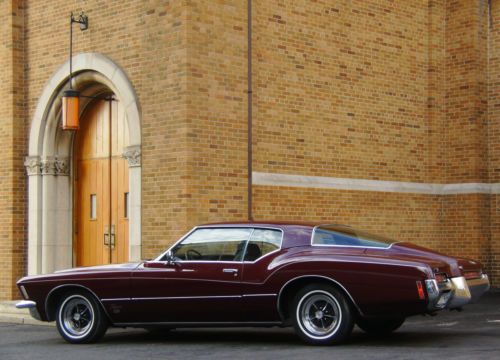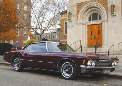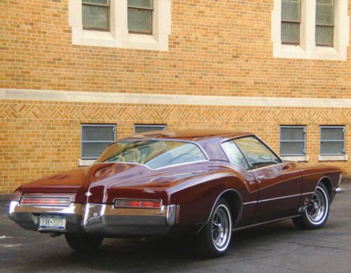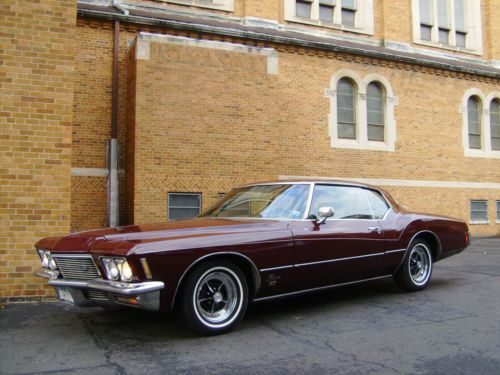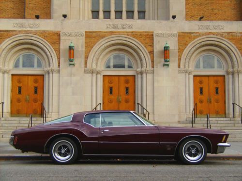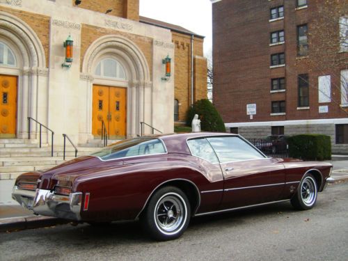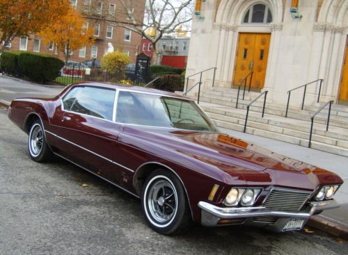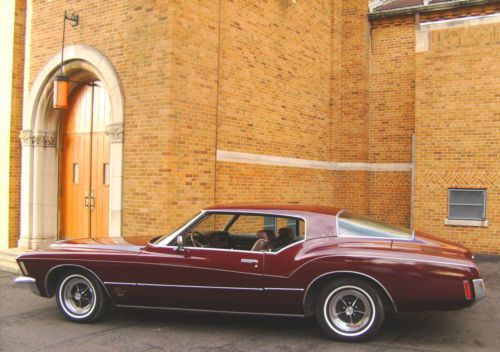 1971 Buick Riviera GS Factory Gran Sport - First year of the beautifully redesigned and sensational 1971 model year Riviera, featuring the dramatic, flowing boat-tail styling with sweeping, sculpted sides, coupled with the very desirable GS Gran Sport option, makes this very low production dream car a very rare automobile. The GS option includes the Big Block 455 ci V-8 matching-numbers 7.5 L engine linked to the rugged, specially calibrated Turbohydramatic 400 three-speed transmission, topped with the exclusive GS chrome air cleaner. GS features include automatic floor gear shifter mounted on a center console that is canted towards the driver for ease of operation, and heavy duty springs, shocks and stabilizer bars. I am not the original owner to verify any mileage, the odometer reads 10425. This GS is not at all tired and is very fast and responsive. The distinctive V-butted rear window and the spine running down the full length of the car, through the roofline and down through the boat tail were design cues inspired by the 1963 Corvette Sting Ray split window coupe. Other distinctive features on the 1971 Buick Riviera are the dual deck lid slotted ventilation system louvres on the trunk lid, only available in 1971, Buick's Mack trac traction control system (prevents wheelspin during acceleration on slippery surfaces), and numerous GS standard features making this Gran Sport fully loaded, including Factory A/C, Power Steering, Power Front Disc Brakes, Power Windows, Power Seat, Dual Exhaust, Safety Speed Alarm, Tilt Steering Wheel, AM/FM Radio, Buick Chrome Mag Wheels including the spare in the trunk, original jack, factory body-side moulding, trunk light, owners manual etc. Always garaged, this GS is strong and solid (no body filler) including the undercarriage, floors and trunk. This particular GS spent its entire life in the dry NM climate until 2002 when it was shipped here to NY and garaged and cared for ever since. Chrome is gorgeous including the rear bumper which is seldom seen free of dings or damage. The GS drives and shifts beautifully and always garners much attention and many compliments whenever it is seen. A Top-of-the-line classic; a motion-sculpted work of art from any angle viewed. Gorgeous unexcelled Bill Mitchell concept car design. Low starting bid. Please bid with confidence. This is rare opportunity to own this very low production GS model. No reserve auction. For any further detailed information, please call (718) 486-3271. NY Thank you. |