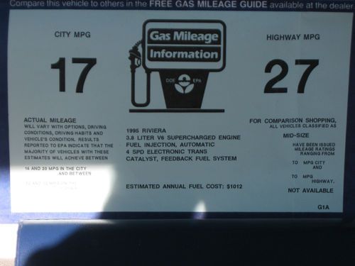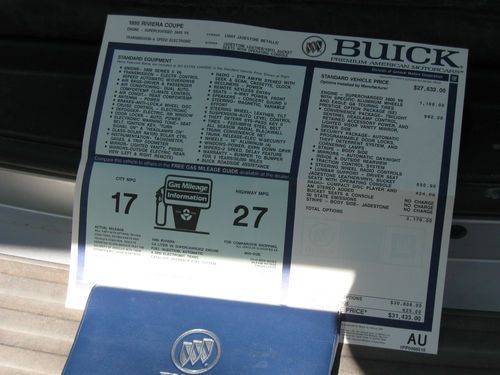 1995 Buick Rivera Supercharged 2-door coupe. I am selling this car for a friend of mine. One-owner, immaculate inside and out. Spare tire has never been used. Adult-owned, pampered car bought new in Plainview, Texas, always stored inside. 57,000 actual miles. Comes with perfect window sticker, broadcast codes. Supercharged 3800 V6 with Electric control 4-speed automatic with overdrive. 27 estimated highway miles per gallon. No flaws or tears in interior leather or original carpet. Bid with confidence, this is a beautiful car that should increase in value in years to come.