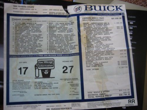 This is a very nice two-owner, low mileage, 1995 supercharged Buick Riviera. This is the first year of the (8th) or last, generation of the Buick Riviera. It is a personal luxury car. It runs very well and has a wonderful ride. I am the second owner and have kept the Buick garaged since I purchased it in Texas in 2011. The first and original owner said, "The Buick has been garaged since new". It is in good condition for a 19 year old car. The EPA gas mileage is 17 city and 27 highway, from the Riviera's 3.8 liter supercharged V 6. The tires are almost new Goodyear Weather Handlers. The air conditioner compressor was replaced recently and it works great. The rear air leveling shocks are new. The interior of this Buick is in beautiful condition. The paint is Light Winsor Gray Metallic. The paint is in good shape except for some scratches and a couple of door dings. The Riviera does not have any rust or rot. Two of the wheel trim clips are loose. I have inserted pictures of the damaged areas on the Riviera, please look them over. Also, the automatic antennae is not working. It makes noise but does not rise. The windshield washer when activated leaks near the tank. The rear AC vent is missing a cover, (please see picture) but does not effect the operation of the air conditioning. Also included is the original dealer window sticker, two keys and remotes, two 1995 Riviera brochures, and book one and two of the 1995 Riviera service manuals. Please look over the pictures and feel free to ask any questions. I think I have covered everything but remember this is a 19 year old car and is being sold as is where is. If the Buick is to be shipped it will be the responsibility of the buyer to make all arrangements. I will be happy to work with the buyer and shipper in a limited position. If you fly in to pick up the Buick, I will work with you in person to complete the deal. If you live close by, please check out the Buick in person. If you have any questions, please don't hesitate to ask. The Buick is also for sale locally. I reserve the right to end the auction early if the Riviera is no longer available. Thanks and happy bidding. THE WINNING BIDDER MUST CONTACT ME WITH IN 24 HRS AFTER THE AUCTION ENDS AND I MUST HAVE A $500 NON REFUNDABLE DEPOSIT WITH IN 72 HOURS UNLESS OTHER ARRANGEMENTS HAVE BEEN MADE PRIOR TO BIDDING. THE REMAINDER OF THE PURCHASE PRICE MUST BE PAID WITHIN SEVEN BUSSINESS DAYS OR WHEN THE BUICK IS PICKED UP, WHICH EVER COMES FIRST.