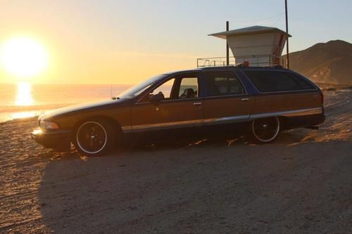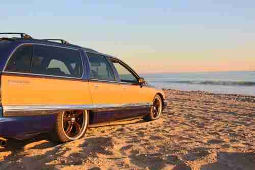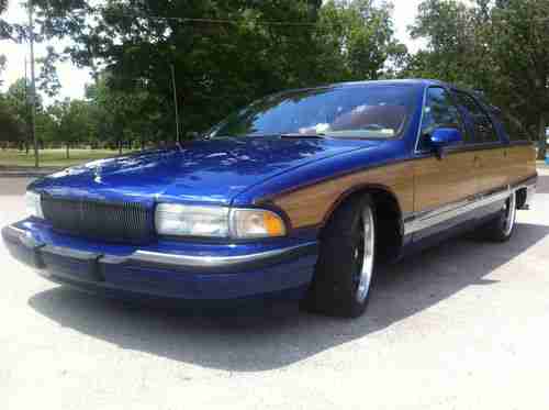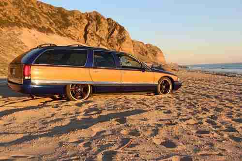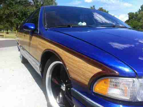 This is a Cult Classic Custom Wagon that gets a lot of attention, not only for being unique, but actually cool. It is a great cruiser that rides smooth w/ plenty of power. I painted it deep metallic blue about 6 months ago. I have lowered it 2'' all the way around for an aggressive look and better handling using Belltech Springs. It sits on custom wood grain painted Boss 338 5 spoke wheels, (18'' up front and 20'' out back). The front tires are brand new and the rears still have 80% life. The interior is in really good condition and is super comfortable that make road trips a breeze, which is primarily what the car has done its whole life. 100k miles that are legitimately HWY. I drove it from Missouri out to Ca in November and it was a pleasure w/ no issues at all. I love the car, but its time to let it go for something different and more conducive to my work. I know whoever gets it will love it. Happy Bidding!
