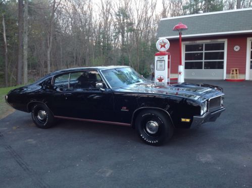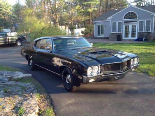 This car is up for sale out of private collection is a 1970 Buick GS 455 non console 4 speed. All original drive train, matching numbers. Only 34,214 original miles. One of 510 in 1970 Buick GS 455 built. Unsure of how many all black but it's definitely a low amount.....legendary interior is perfect. All gauges, dash, radio were totally restored with original hurst shifter. The car was restored by American muscle car restoration inc. the trunk is how it should be with correct spare, jack and mat. Undercarriage and engine bay are show ready, car has dog dish caps with Goodyear polyglas gt 60-15 tires. It has front disk brakes, am/fm radio tach, headrest's, remote mirrors, original floor mats, pictures do this car no justice. Documented from Buick to be correct GS. 70K invested. This GS is a multiple SHOW winner. Scott 508-265-2617 whitey19@icloud.com