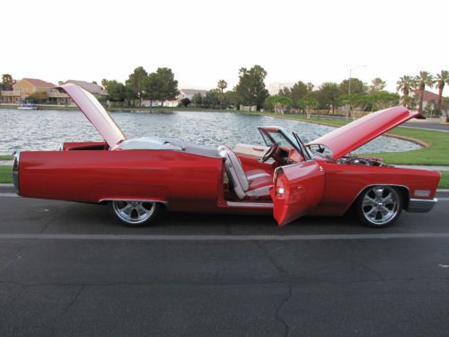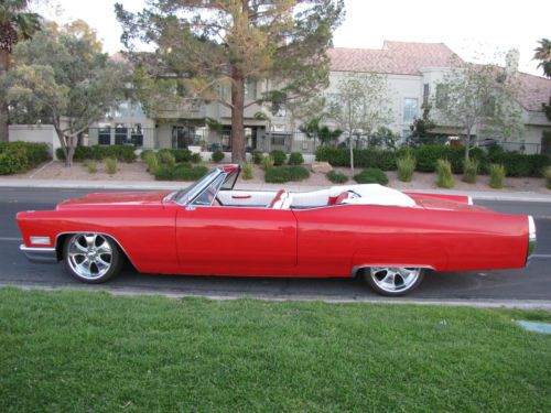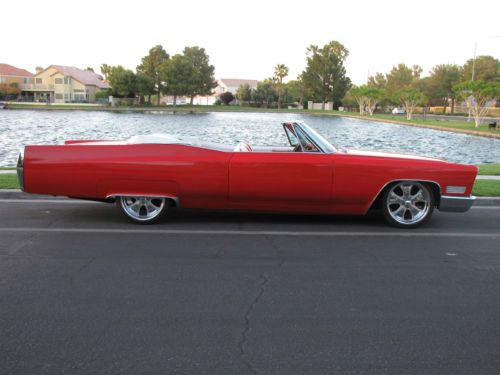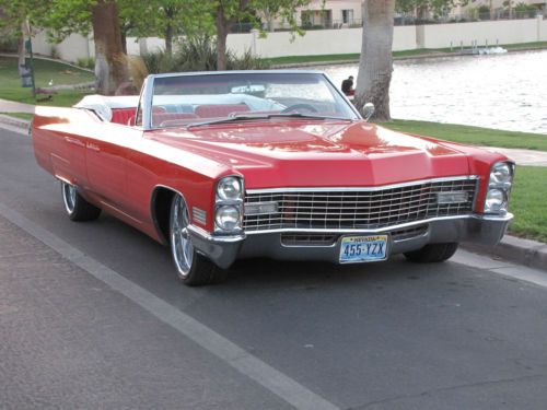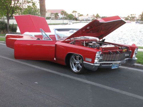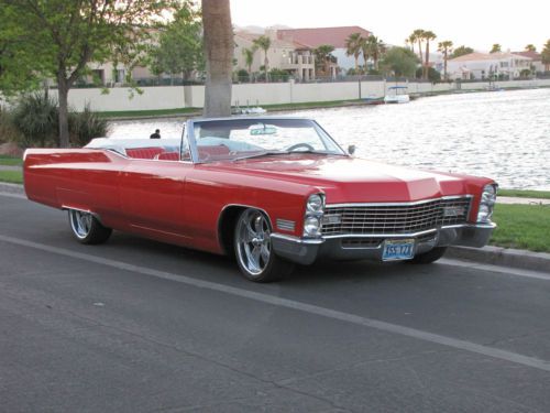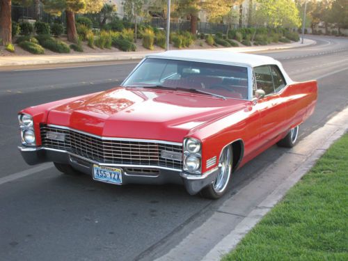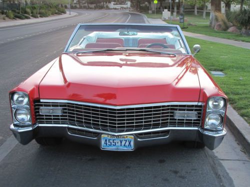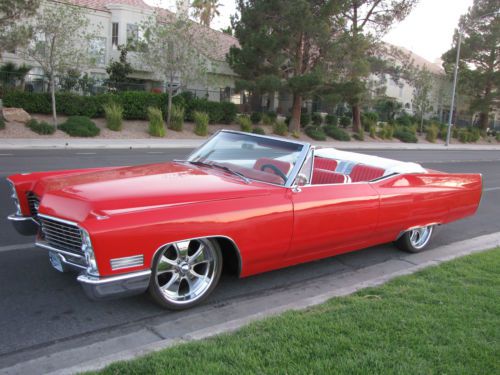 THIS IS BEAUTIFUL AND LOADED 1967 CONVERTIBLE CADILLAC COUPE DEVILLE ...!!! ........IF YOU DONT MIND PEOPLE STOPPING YOU WHERE EVER YOU GO AND GIVING YOU COMPLIMENTS AND ASKING YOU QUESTIONS ABOUT YOUR CAR THEN THIS CAR IS FOR YOU ......ITS REAL ATTENTION GETTER ....LET THE PICTURES SPEAK FOR THEM SELF........ CAR RUNS AND DRIVE GREAT ..... TONS OF WORK HAS BEEN DONE TO THE CAR ... SOME BY ME , SOME BY PREVIOUS OWNER ...ALL THE STUFF HAS BEEN DONE WITH IN LAST FEW YEARS...... ENGINE AND TRANSMISSION HAVE BEEN REDONE AND THEY WORK GREAT .... AS YOU CAN SEE ON THE PICTURES , ENGINE HAS BEEN REPAINTED TO MATCH UP THE CAR COLOR , ALSO THERE IS A LOT OF CHROME ON THE ENGINE AS WELL ...DUAL BATTERIES ....JUST GOT ALTERNATOR REBUILT RECENTLY ALIGNED ..VERY RELAIBLE , IF YOU WISH YOU CAN USE IT AS DAILY DRIVER ......STARTS RIGHT UP ... NEVER OVERHEATED ON HOT SUMMER LAS VEGAS DAYS.......... BODY ITS VERY STRAIGHT WITH NO DENTS OR DINGS ....IT IS NEVADA CAR SO THERE IS NO RUST ANYWHERE AS Y"U WOULD EXPECT ........CAR ITS BEEN REPAINTED ....HAS A NEW TOP AND GOES UP AND DOWN FINE ....ALL GLASS ITS FINE WITH NO CRACKS ....INTERIOR ITS BEEN REDONE AND SHOWS VERY NICE AS WELL AS TRUNK AREA (REDONE ) ....THERE IS RADIO WITH CD PLAYER , HIDDEN SPEAKERS , AMPLIFIER IN THE TRUNK , ANTENA HAD BEEN SHAVED OFF , THERE IS A ONE HIDDEN UNDER NEATH THE DASHBOARD ......I GOT THE DOOR HANDLES , TRUNK LOCK AND EMBLEMS SHAVED OFF, GOT POPPERS INSTALLED ..LOOKS SO MUCH CLEANER .......CAR ITS LOWERED 5 INCHES .... SEATS ON 20" OASIS WHEELS WITH LOW PROFILE TIRES.................. IF YOU HAVE ANY QUESTIONS , CALL ME AT 702 300 3476 .... ITS TO MANY THINGS DONE TO IT TO LI ST THEM ALL