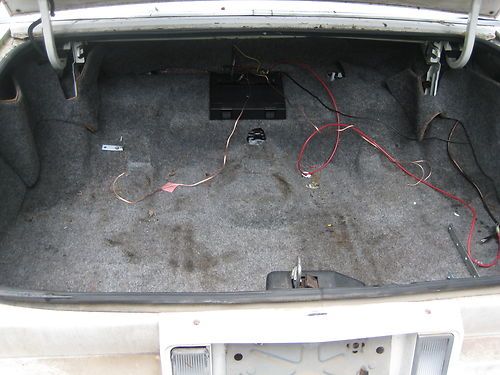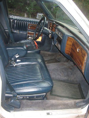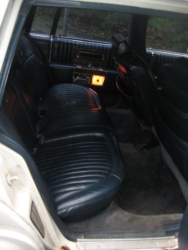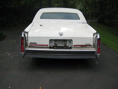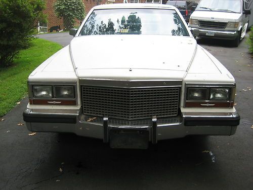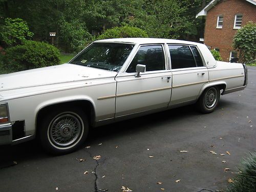 1987 Cadillac Fleetwood Broughman in good shape. 5.0 engine, automatic transmission. Odometer states 64,500 miles - vehicle is still being driven. Current Virginia inspection - expires in September. White exterior. White vinyl top has few slits in the roof and some cracks around the rear window. Body in good shape - few areas of surface rust under rear decklid and bottom right of trunk. Typical plastic bumper extensions front and rear are cracked. Tires have good tread and all original hubcaps included. Motor has many tune-up parts put on over the past few months. Starts right up - check engine light comes on sporatically while driving. Aftermarket head unit professionally installed. Bring a tag and drive her home.
