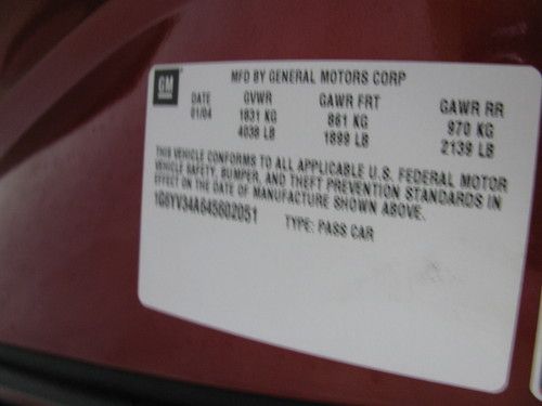 152 - SHALE LEATHER 15I - SHALE INTERIOR TRIM 1SZ - OPTION PACKAGE DISCOUNT 86U - CRIMSON PEARL AJ7 - SIDE IMPACT AIR BAGS AQ9 - FRONT BUCKET SEATS BGR - BOWLING GREEN PLANT CJ2 - CLIMATE CONTROL DD0 - OSRV POWER MIRRORS DL5 - DECAL - ROADSIDE SERVICE INFO E2C - ORDER TO DELIVERY EXPEDIATE FE2 - SUSPENSION SYSTEM RIDE HNDLG FE9 - 50-STATE EMISSIONS FEDERAL EMISSIONS GW9 - REAR AXLE 2.93 RATIO IL2 - TRIM INTERIOR DESIGN JJA - PT DRESS SUBASSEMBLY INSTALLED JL9 - 4-WHEEL ANTILOCK DISC BRAKES K59 - ELECTRONIC CRUISE CONTROL ADAPTIVE CRUISE CONTROL KG4 - 150 AMP GENERATOR LH2 - 4.6L DOHC V8 SFI ENGINE M22 - 5 SPEED AUTOMATIC TRANSMISSION MX0 - 5 SPEED AUTOMATIC TRANSMISSION N30 - DELUXE STEERING WHEEL WOOD TRIM PACKAGE NT9 - EMISSION - FEDERAL - TIER 2 QF8 - 18" ALUMINUM POLISHED WHEELS QMS - P235/50R18-97W TIRES R9Z - POMS EXPEDITE-SOLD ORDERS/TSE SLL - SOLD ORDERS U2K - XM SATELLITE RADIO-100 CHANNELS OF GO ANYWHERE ENTERTAINMENT SERVICE FEE EXTRA.1ST 3MOS.INCL U2R - INFOTAINMENT SYSTEM CONTENT U52 - ELECTRONIC INSTRUMENTATION U63 - PREMIUM SPEAKER SYSTEM UE1 - ONSTAR COMMUNICATIONS SYSTEM INCL 1 YR SAFE & SOUND PLAN UG1 - UNIVERSAL TRANSMITTER UJ9 - TIRE PRESSURE MONITOR SYSTEM US3 - INTEGRAL ANTENNA UV6 - HEADS UP DISPLAY V73 - VEHICLE STATEMENT VA5 - ENGLISH LABEL VDD - CUSTOMER ORIENTATION VK3 - LICENSE PLATE FRAME VM3 - LABEL INFORMATION CONUMER CONTAINS BPR IMP STANDARD FOR FRT 5MPH & RR 5MPH