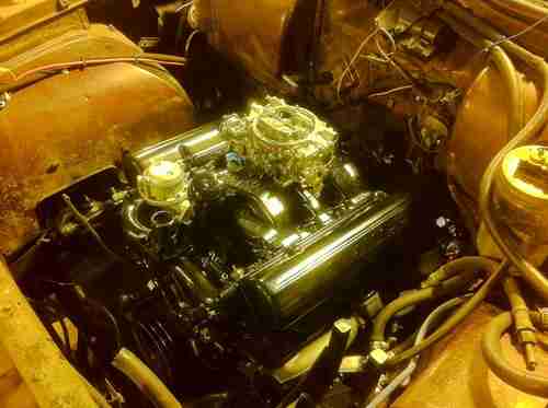 The motor is brand new rebuilt by Precision Machine in North Vancouver, '57 365, .030 pistons from Egge Machine, 10:1 CR, factory 2x4 Eldorado cam grind, Edelbrock 1406 carb, pertronics elecronic ign, all new internally and externally, alt, starter, battery, carb, all new. Fresh paint on everything. Brand new re-cored radiator by Richardson Rad, all hoses and heater hose new. Bendstens adapter and re-built GM 700R4 OD trans, custom driveshaft, new U-joints. New custom 2" exhaust, shortened Smithys glasspacks, exits through bumper as factory.