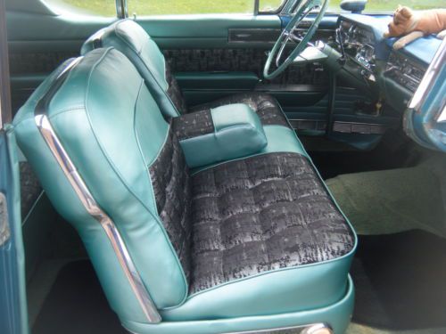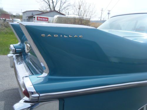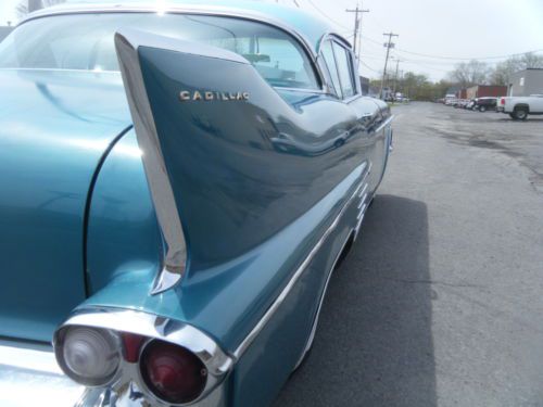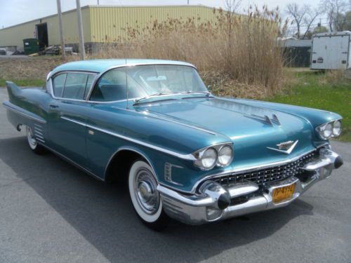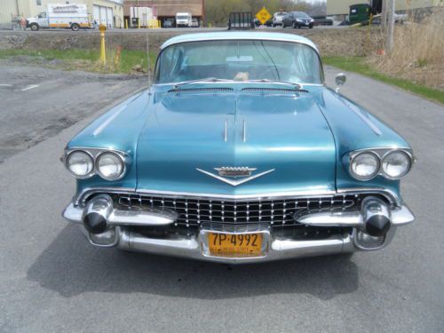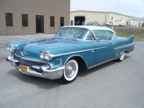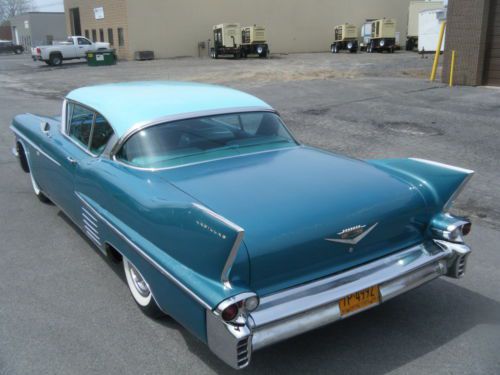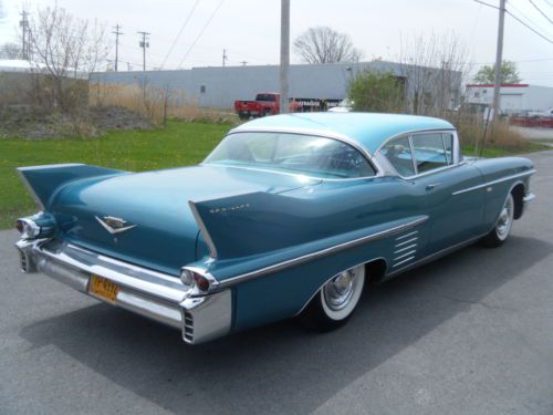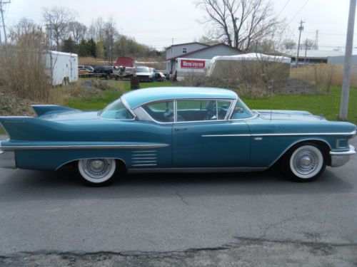 Here is a very good looking 1958 Cadillac Deluxe Coupe Deville. It came with a nice factory color combination of (Peacock )over (Turquoise).Its an older restoration showing wear. Its not a show car.It will need to be repainted as there are a lot of chips in the paint, mainly on top of the car where the clear coat has peeled away. That being said its still a very very good looking and driving car. The chrome is in decent shape and has chips and flaking, but to make real nice you would want to redo the bumpers. Body and bumpers are solid. Glass is good and all windows work. All lights and gauges seem to be working. The wipers work also . The radio is not working. The engine and trunk are original and not detailed. The interior was redone a few years back in original material and looks great. The seats are soft and in great shape. The carpet is a little faded and the dash could use a recover. The headliner is in great condition. This is a nice looking and driving Caddy. You don't find many 58 Coupe Devilles for sale. Drive it now, summer is here..Its being sold As Is. Happy Bidding!!