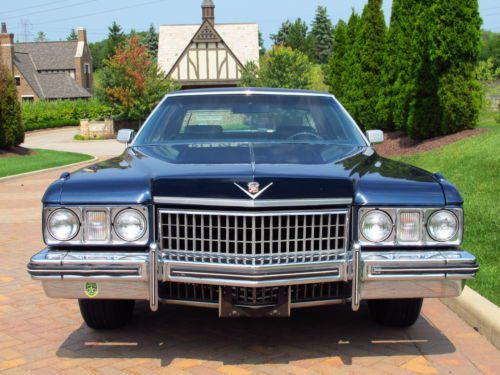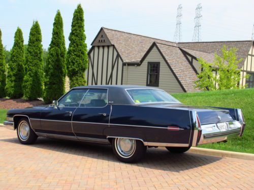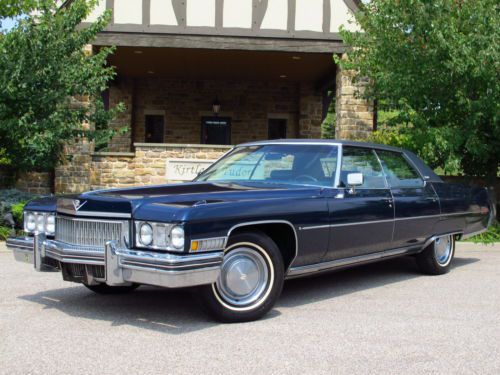 This is my 1973 Cadillac Sedan DeVille with only 65,291 original miles. This car was purchased new at Clairmont Cadillac Corporation in Montclair, NJ on August 31, 1973 by Mr. Jack C. Tancrel, aged 55. Soon after, Mr. Tancrel retired to Florida and took the car with him. He kept the car garaged and perfectly maintained for the rest of his life. The original purchase price in 1973 was $6495.00 and I have all of the original dealer sales paperwork, warranty papers and even letters written back and forth to Cadillac for warranty work. I also have a stack of service records, paperwork and receipts dating back to new plus the original books and manuals. The list of paperwork and documentation is extensive; it documents the car from brand new. In 2007 the car was sold by his surviving spouse to their next-door neighbors in Florida. These folks are retired and keep a collection of classic American cars. They spend their winters in Florida and their summers here in Northeast Ohio. The car has not been exposed road salt or snow; it has either spent its winters in Florida or in a dry garage up north. This Cadillac has been outstandingly well-preserved. For a 40-year old car, it looks, runs and drives superbly well. This car has ALWAYS been perfectly maintained and well cared-for. Rarely will you find a 40-year old car like this with a fully documented history since new. This car has the original sales paperwork from new, and a huge stack of service records that are as recent as last year. The service records and maintenance history are beyond compare. The car was repainted once in 1985 and a superb job was done. This paint job looks excellent- the finish carries an excellent gloss and the car looks beautiful. There is no exterior body panel rust- this car is about 98% rust-free. It is completely solid in every way, including underneath. This is a superbly well-preserved car in gorgeous clean condition. The interior of the car is original, and it is in excellent condition. The seat upholstery, carpets and dash are clean and in very good condition. The interior has held up exceptionally well over 40 years. This car runs and drives outstandingly well. The engine starts and runs smoothly and it makes excellent power. The engine does not smoke or hesitate, nor does it show any undue fluid leaks. This is a quiet, comfortable and smooth vehicle. The brakes are powerful and stop well. The suspension is comfortable and tight, with no clunks. The steering is smooth and precise. This car drives and rides exceptionally well. This car has no known mechanical or electrical problems and it is ready to drive anywhere. I would not hesitate to drive this car across the country. They don't make cars like this anymore- big, heavy, body-on-frame, high-quality RWD American cars are part of our history. This car has the following equipment and options: