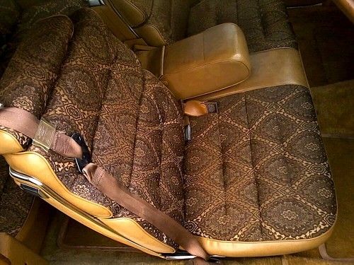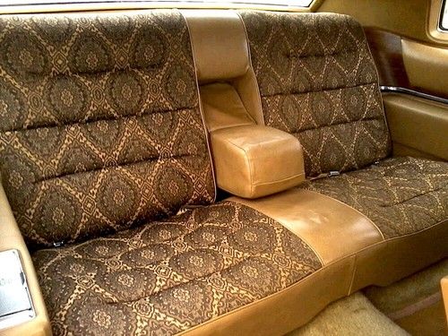 - INTERIOR: The interior is above-average, and fantastic. It's tan, and features the very 70's Maharajah fabric pattern. You don't see this kind of pattern on anything anymore, especially cars. Everything is all original, and in great shape. The headliner, steering wheel, rear dash, and seats are perfect. The carpet is a little sun faded in some areas, due to age, and there is a tiny crack in the side of the dashboard. Everything else is near perfect.