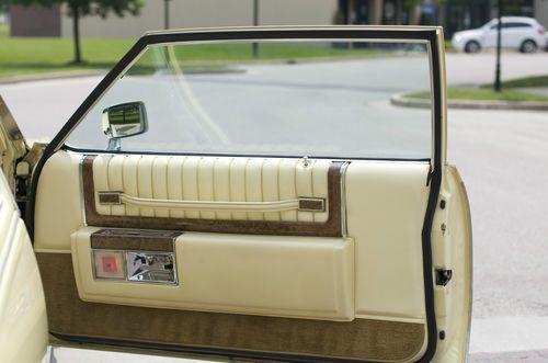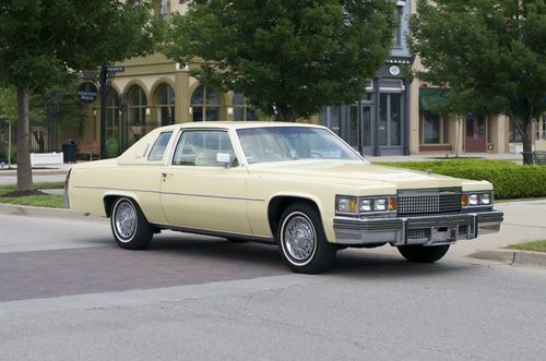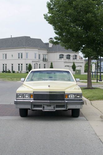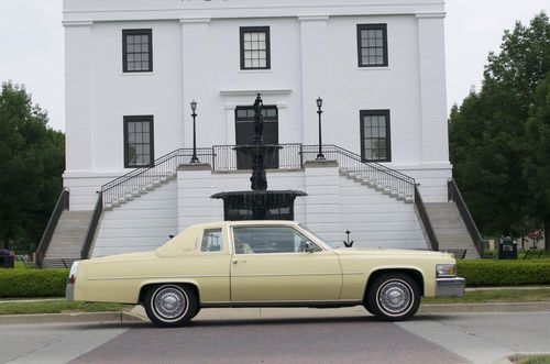 Up for a "no reserve" auction is an absolute studding 2DR 1979 Cadillac Coupe Deville that has been garage kept it's entire life. This Cadillac has had just 2 owners and the 83 year old 2nd owner owned it since 1980. This Caddy has a very rare color combination & it is stunning. The springtime yellow exterior is all original except for the rear fillers, which were done with the heavy duty replacements. The body is laser straight and the paint is remarkable for being more than 34 years old. Nice luster that is smooth to the touch. Contrasting yellow 1/4 vinyl roof with opera lights. No rust under the top trim moldings like most have. The chrome grill and bumpers are truly spectacular, they gleam, no pitting or fade. The yellow leather interior is equally impressive and still smells like new. The leather is all original and only flaw I could find is a small area on the lower back of the drivers bolster, no rips. The door panels are all original with no cracks, tears or fading. The olive dash with woodgrain is gorgeous and the chrome vents are like new. The golden cut pile carpeting still has it's original sheen and looks nice. The carpets are covered by the original Cadillac floor mats. The drivetrain consists of the powerful 7.0 Litre 425ci 180HP/320TQ V/8 engine, runs and sounds great. No leaks or smoke, it does have just 60K, recent replacement of belts and hoses. Recently replaced the A/C compressor and dryer with GM Delco replacement parts R-34 Freon. Transmission shifts on the dime with no slipping. I kept the engine valve covers original and not all painted up to hide anything. Nicely equip for the year also tested and seems to be working properly are the door locks, tilt, cruise, power seat, factory AM/FM with 8-track tape player. Power antenna also works. As noted also has new ice cold air conditioning. **Car is also for sale locally buyer reserves right to sell and end auction early.