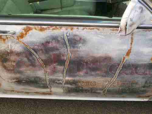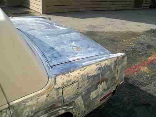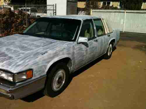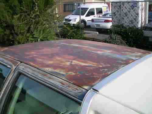 NO RESERVE!!! The SEVENTH picture you see is what the car looked like when I purchased it over a year ago. I bought the car to experiment with giving a car a natural patina look and using my art skills I accomplished a bad-ass look on the hood, top, and trunk lid, the remainder of the car I was more subtle and had to be because the front left and right fenders are abs plastic and I painted them to look rusted (see photos). I bought this car from the second owner who was a Union 76 service station owner in my town. The title is clear and in my name, this is NOT a flip or story about the car is a friend's and I'm selling it for them... This is my car! With that out of the way, at 142,466 miles the car was given a new set of Michelin Harmony 95T tires all the way around. P205/70R15, a full lube job, windshield wipers, smog inspection( and yes it did pass, California is real particular about that). At the same time, the serpentine belt was replaced, the cooling system was serviced, and the car was made road ready. It's fun to drive and you definitely get the looks, more on that in a minute. Yes, the wheels are orange, they are NOT painted, they were professionally powder-coated by Armando at PERMACOLOR in my town. Center caps were purchased new on ebay and installed. On December 3, 2012 a new First Interstate battery was installed, along with BG pad protectors. The car was professionally lowered by the award-winning team at Scott's Hotrods N Customs in Oxnard, Ca. Cadillacs have an automatic load lifter so when people sit in the back seat the car will raise up, this was disconnected, but not removed and if desired it can be reconnected. The factory radio works only sometimes, it has a cassette player, but I will include a new Kenwood KDC stereo radio and CD player in the box in the purchase... ya gotta have tunes. There is a crusty bubble at the side rear of the drivers side, just up and left of the gas filler door. (see photos) and the trunk will close, but it's a little tricky and does take some finesse. Dependable, YES... I had the car gone through so that it is always road-ready, starts right up and when you put your foot down, the car knows what you want to do., Headlamps, turn signals, brake lights, dome light, door lights, back up lights, license plate lights all work, gauges work fine and the mileage is true. Brakes are fine and the tranny and engine perform as they should. Lots of room in this car. The interior is white and in great condition, although the seats could use a good scrubbing, personally, I would have them dyed white, it's faster and they would look new if you did. The carpet and dash are blue, vinyl top is in good condition. I addedd a Stroh's Beer Tap to the selector, it's old, since it has Detroit 26, Michigan rather than a zip code on it. (see photo) I yellowed the front turn signals and blacked out the grille center see photo and compare to the original shot of the car.