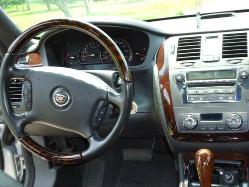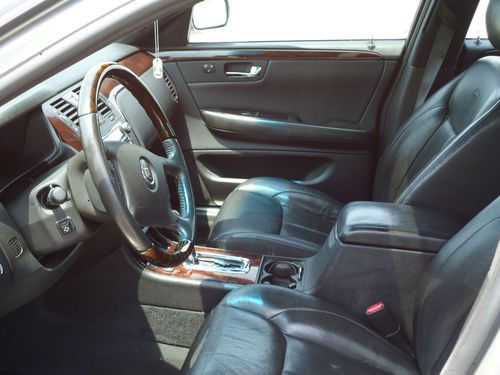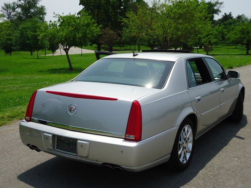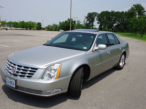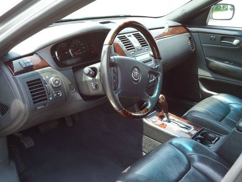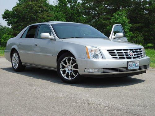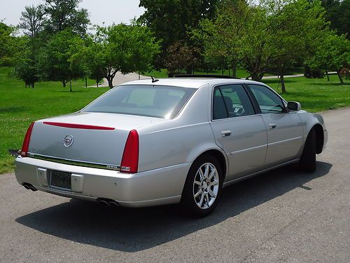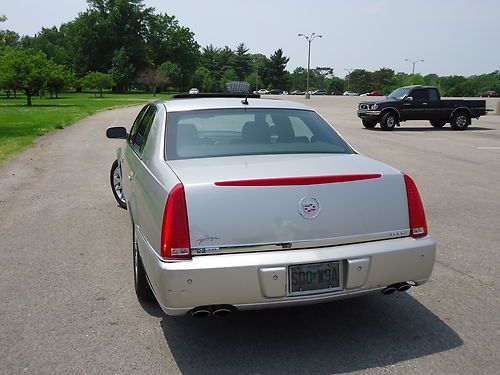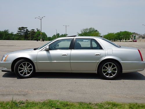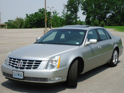 2 owner 2006 Cadillac DTS sedan fully loaded with a low reserve. Newer 18" Goodyear Eagle tires with less than 2000 miles. Silver exterior with black leather interior, options include sunroof, heated and cooled seats with massaging feature, heated steering wheel, dual climate control, clear bra, wood grain dash and steering wheel accents, front and rear parking sensors, rear heated seats, 2 key fobs with individual memory settings for seat and mirror positions, 6 disc Bose upgraded stereo, auto dimming headlights, homelink. Car was factory certified until late 2012, all service and maintenance performed at authorized Cadillac dealer. Non-smoker vehicle. Car has very minor damage from hail on trunk and hood, barely visible unless inspected closely. OEM 18" wheels are in excellent shape and car includes new Cadillac floormats still in the plastic.