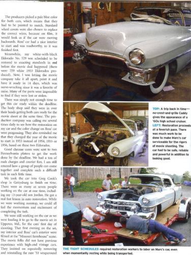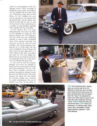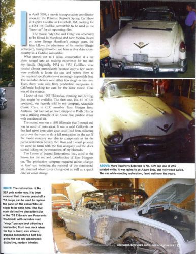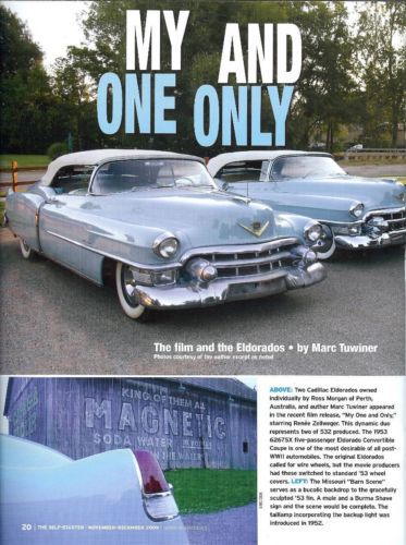 1953 Cadillac Eldorado Convertible - Used in the movie My One and Only Almost as much of a star as its fellow cast, including Ren?e Zellweger and Logan Lerman, this vehicle played the family's get-away from a troubled life in New York in the 2009 movie My One and Only. Since filming, it has been starred in several magazines including Cadillac Self Starter and Old Cars Weekly. Originally from California, the car was purchased in Hollywood by me as a 95% rust-free white car with a black interior. It is one of the last 1953 Eldorados produced.