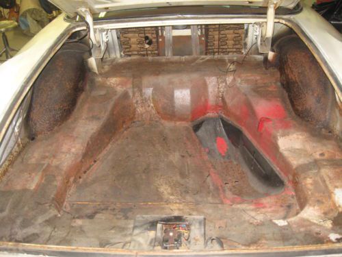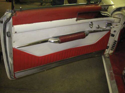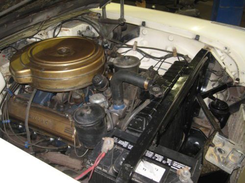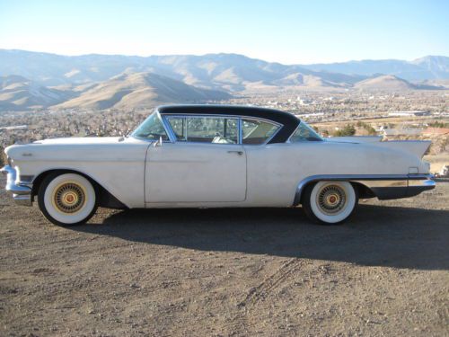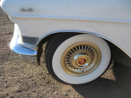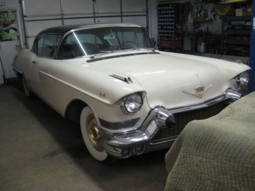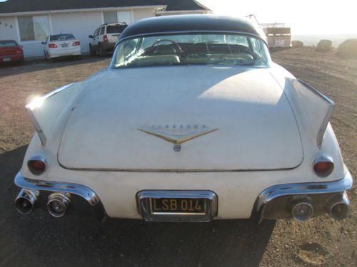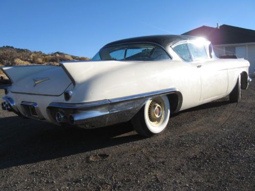 1957 Cadillac Eldorado Seville. White with red and white interior. Very sound, RUST FREE Nevada original vehicle. Repainted about 50 years ago. Runs and drives. Does not smoke. I believe the mileage to be original due to the many service records I have for the last 40 years, and the condition of the vehicle, but I cannot guarantee it. Does not smoke, but needs tune-up. Interior is all original, but seats need to be redone as does the paint. Black vinyl top was taken off and it needs correct top put back on. New Cooker wide whites. Needs a new dash pad. Vehicle now has a single 4 BBL intake and carb. Included is the 2-4 BBL intake and carbs. I do not have the batwing air cleaner. Have owned this car for years and have driven around our local streets, but have never been on the freeway with it. Serial number on motor matches vin number. All power windows work as does power seat. Radio works, but power antenna does not go up. I believe all brake lights, headlights and turn signals work. Clear title. Original owners manual included. Sold in as is condition. Buyer responsible for shipping. I have extra Eldorado parts I need to sell, including aluminum bumpers, stainless rear panels, etc. You are welcome to come and inspect this guy. Just give me a call. Dennis---775-882-7620 or 775-315-8265. Very nice orginal aluminum floor mats included.(red rubber)