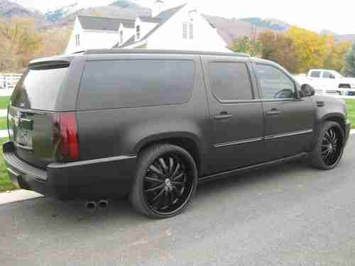 2009 Escalade with LOW MILES 22K. For other pics Please call 8O16471O12 or send me your email. This vehicle spent most of its life "occasionally" being driven in Southern California. The miles are low due to the other half dozen flat black vehicles that were driven more often by this couple. That and during the off season family spent a lot of time out of the country. I would love to keep it but its a little flashy for my conservative wife and kids (actually the kids vote to keep but the wife wins.) There was no expense spared by this custom shop on the west coast that did most of the upgrades which include 26 inch wheels, 2 inch lowered suspension, flat or matt black paint, sound system, etc. all professionally done. I figure roughly about $130k originally invested when keys were turned over and it is a blast to drive and sure turns heads. Although in Utah I kept it inside always and rarely drove it during the past winter. Tires only have a few thousand miles on them. Has all the bells and whistles...retractable running boards, dual DVD, navigation, sound system etc... I only mention the celebrity owned because the work that was done was quality and well done. There are a few minor flaws but for over 20k miles looks amazing. One tiny ding in the right read quarter area about the size of a pencil eraser. The front bumper has a couple minor nicks etc. from normal wear and tear very small. A little piece of paint has peeled off the door handle under the lever not easy to see just a little larger than a quarter (quote of couple hundred to redo). No real door dings or major scratches/flaws. Just a couple tiny hard to notice. We spend a lot of time in the summer at a summer cabin (dirt roads/beach etc. and I just cant use this and see it get beat up). It needs to go to someone who will appreciate a one of a kind and who likes something different than anyone else out there. If you like to name drop I will show the buyer a couple other things about the previous owner which I was politely asked not to include in this listing. Sound system is awesome but my kids pushed some buttons recently and I need a techy to help me turn it back on.