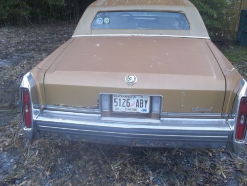 I BOUGHT THIS CADDY AS A PARTS CAR TO REPAIR MINE BUT HAVE SINCE SOLD THAT CAR SO HAVE THIS CAR FOR SALE IT WAS BOUGHT FROM A GENTLEMAN IN ATLANTA AS A NON RUNNER HE TOLD ME HIS UNCLE HAD HIT A SPEED BUMP AND THE OIL HAD DRAINED FROM THE ENGINE AND HE HAD NOT STARTED IT SINCE THEN DON'T KNOW IF THE ENGINE IS CEASED UP OR NOT YOU WILL HAVE TO TAKE YOUR CHANCES WITH THAT. EVERYTHING IS ON THE CAR AND IS IN FAIRLY GOOD CONDITION TIRES ARE NEARLY NEW BUT HAVE A BIT OF DRY ROT AND CHROME IS PRETTY GOOD SELLING THE CAR AS IS IN MACON GA WILL HELP TO LOAD ON TRANSPORTER BUT BUYER PAYS FOR SHIPPING I HAVE BILL OF SALE AND THE LAST GA REGISTRATION NO TITLE PLEASE DO NOT BID IF YOU DON'T INTEND TO BUY GOODLUCK AND HAPPY BIDDING |