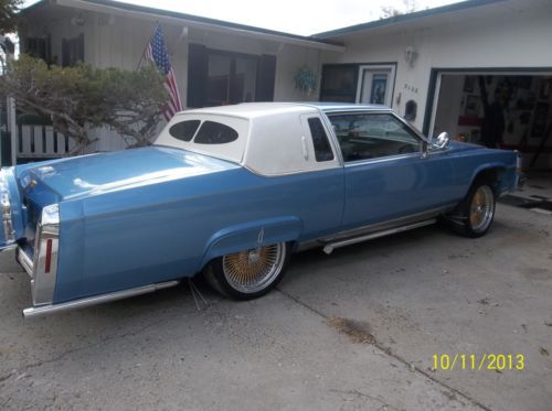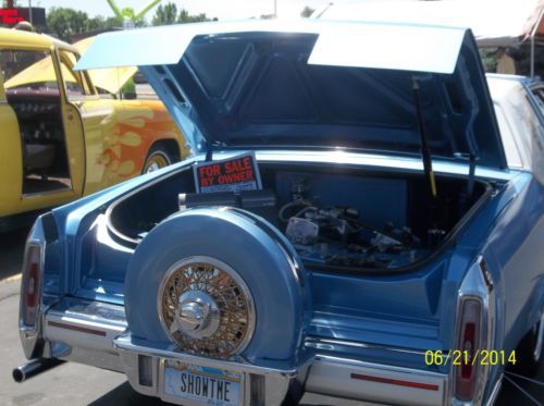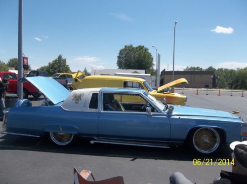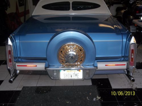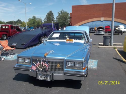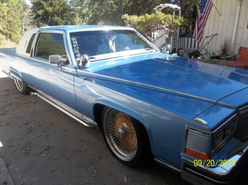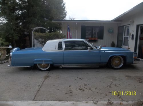 PRICE REDUCTION...RESERVE LOWERED...PANICED, Must sell before I have to report to Prison...kidding !!! At this pricing there is that much just in paint & rims & tires, a true best "best price" Born in Southern California, ( Dicers Car Club ), Lakewood High School 1950's, I was there when it all started, accurate down to the dingle balls & baby shoes, LOL..!!! what I am offering is the real deal, clean, flawless inside and out, the price I'm asking would be the same for a used Harley or a jet ski, this is a lot of car for the money, and you won't see another body like this one, research for yourself, last one made 19851/2, the Continental kit is factory, with graphics added to this paint job you would have a $30,000.00 show piece, ask me questions, I have also lowered my reserve price I will accept,..thank you, Carl Hydraulics car..... 1941 lady gold plated hood ornament..... new Appleton hood spot lights stainless..... windshield new.... etched drivers & passengers windows..... opera window's etched..... new lakes side pipes 70" with caps..... new Bellflower rear 31" side pipes..... Showtime hydraulics..... master & slave..... 8 new deep cell batteries..... new battery engine..... Pioneer two radio amps..... high tech Pioneer radio with built in USB port..... shaved door handles with remote fob..... new chain chrome steering wheel, 11" for driving with hand cuffs on with adapter kit..... sun visor mirrors, rear vision mirror etched..... custom built steel box in trunk holding sub woofers.....Dayton gold 22", 150 spoke rims..... newer low profile tires..... 10 switch control with extended cord..... gold pin striping.....cabriolet top inlayed lace pattern..... inside arm rests front and back tapestry fabric match..... DVD screen in back seat..... custom fender skirts..... retro curb feelers..... radio antenna frenched..... several gold plated front end parts..... Radio capacitor..... 10" rear speakers..... blue drapes all around trunk for shows..... blue dot back up lights..... custom insert rear window..... Dayton rim bow tie knock offs..... RARE: 1985 Cadillac Fleetwood Brougham, coupe 2 door, stopped production half way through the year, only one for sale on ebay in the United States, most expensive American car manufactured..digital fuel injection, four speed automatic with over drive, 195.0" long, curb weight 3346lbs., 249cu.in., 135hp @ 4400rpm, Model: Fleetwood, Trim: Brougham, just reeks CLASS !!! What a find: Continental kit, GM factory "C" package option, stamped 9-23-83, Computer paint matched, all chrome flawless showroom condition..... got most listed but the pictures will tie it together, a true hot rod / custom with very hard to find parts, shows, parades, cruising, park & drop it at your local hang out........ seller can answer any questions, 406-651-4208, will answer your e-mail questions through Ebay service......just a reminder this is an SALE, not a auction, first money drives it home..Thanks, Carl