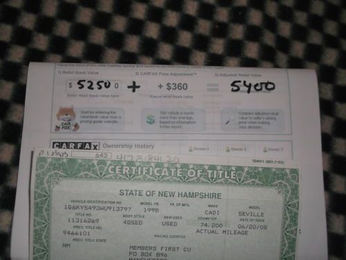 optional STS model with 275 hp v8! loaded as all caddys are, with extremely low 5,624 annually enjoyed miles,(12k being average) divided out yearly by carfax, = 89,975 total, with $1000 add in value, for low mileage,,+$350 car fax add from price on clean condition, has the factory caddy badge on key ring, caddy Crest key, valet key, and 2 sets remote and alarm key fobs,and all work!!!!garaged and stored winters,, and ive had stored past winter at friends indoor garage, pics are from few days ago,waiting for unsalted roads to cruise in,, had plans to custom out, but just got a 63 delta, demanding my love and money! caddy looks and drives awesome, will make a great spring+summer road machine!,,, come drive home, (comes with extra PCMor brain,and new speed sensor,, ....can help with pick up, if shipping can assist in also,..had pro detailed before storage, body still immaculate and interior pretty darn mint looks,and smells new!! thanks for looking! ***! waited for a good rain to clear roads , turned over like new, before storage had $800+in new tune, brake lines,and HD-battery+service done, with reciepts!!! Cruis--en weather is almost here!!!!!books, receipts , spare keys+title in car! ***2 points under 100,,as i sold a 40 year old jag 2 years ago to a kid who thought he was getting a,brand new classic for $2500 dollars, (theres always one out there!!lol),,,if in tri state area feel free to come see can pullout of garage and show anytime!! thanks for looking!!