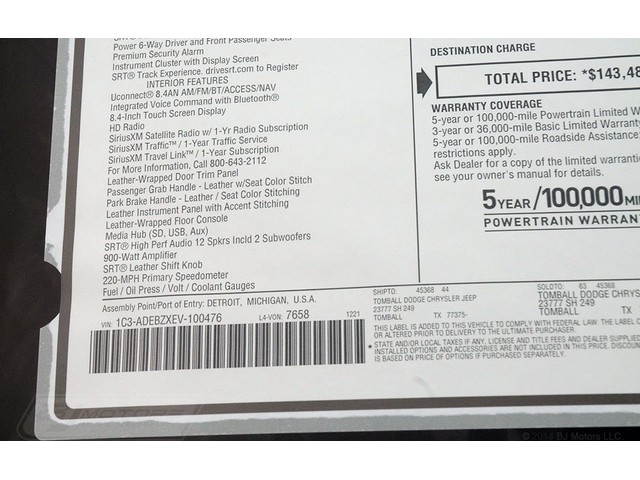 Tomball SRT is located just North west of Houston, Texas. We take pride on our level of customer service with the finest level of quality service. We want your buying experience to be first to none other when purchasing. We have a passion for the vehciles we sell and well work with our customers with financing to transport arrangements.