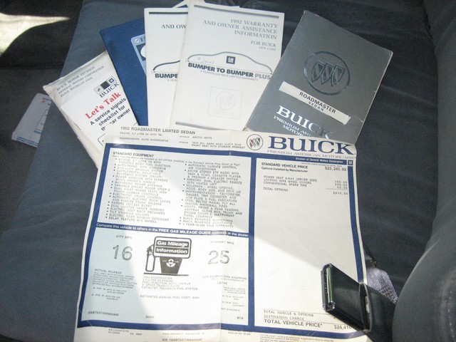 You are viewing a gorgeous 1992 Buick Roadmaster Limited with a beautiful bright white finish and gray/blue interior.  I purchased it from the widow of the original owner, who bought it new from Fiore Buick in Altoona, PA in 1992.  It has 46,867 ORIGINAL miles and has been pampered since new.  (I enjoy driving on weekends, so the mileage will be slightly higher by the end of the auction).  Everything about the car, right down to the stitching in seats, is in beautiful shape.  I have the original owner's manuals and the original window sticker. This beautiful car has many options available in 1992, such as:  vanity mirrors, cruise control, intermittent wipers, power antenna/locks/seats/mirrors, reclining driver & passenger seats (both are power and also have 3 way lumbar), automatic locks, heated driver’s mirror, spoked wire wheel discs, rear defrost, automatic climate control, AM/FM stereo with cassette, remote trunk release, thick-padded plush velour interior (and super soft).  Overall the car is in excellent condition.  The title is clear and has no liens.  The title also documents the original mileage.  This is an extremely comfortable car, and the first year for the reintroduced Roadmaster…with the tried-and-true, reliable, powerful, yet economical 5.7 liter factory Chevy engine and heavy duty 700R4 4 speed automatic with overdrive.  The car runs and drives beautifully and I’m sure it would go across country effortlessly.