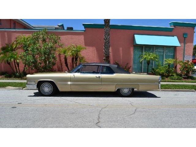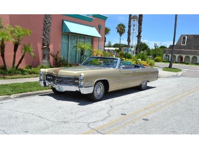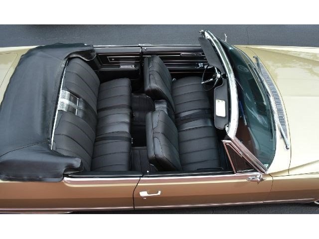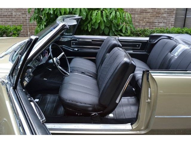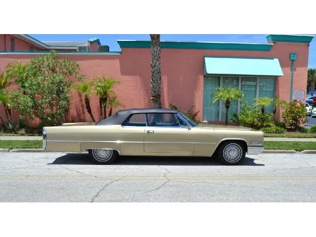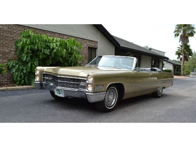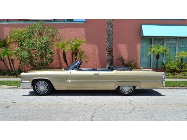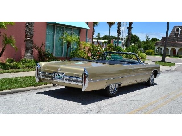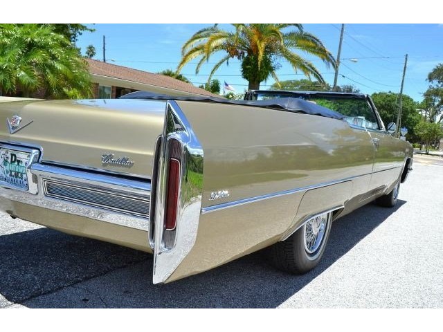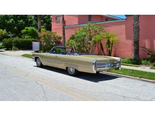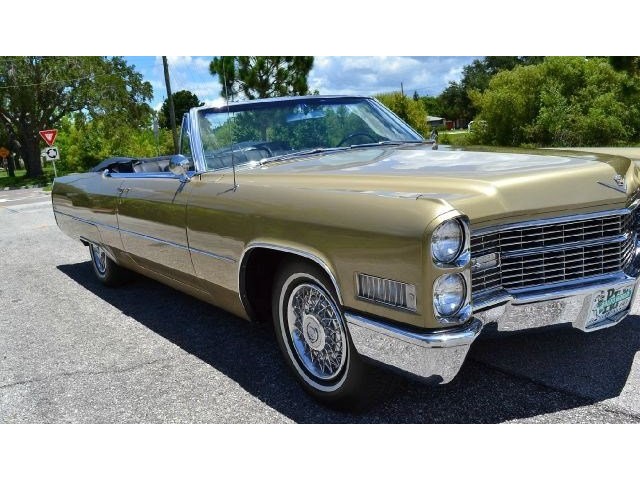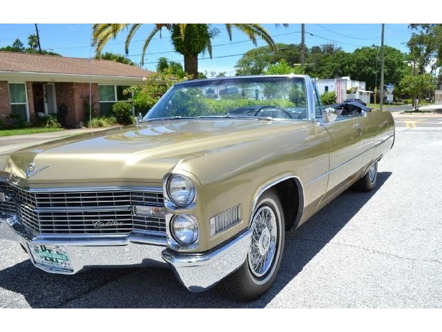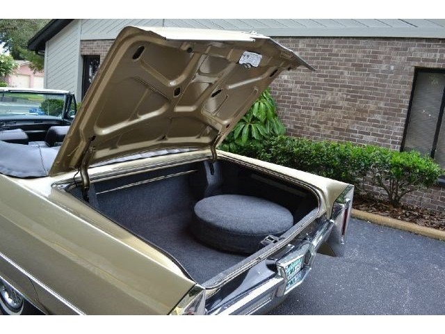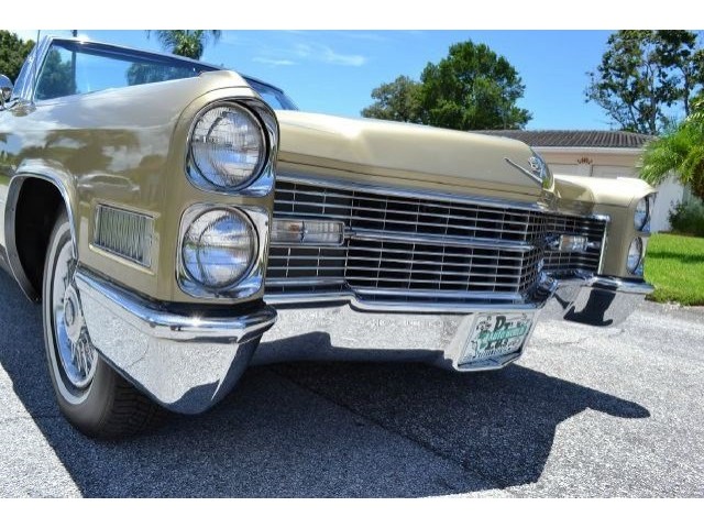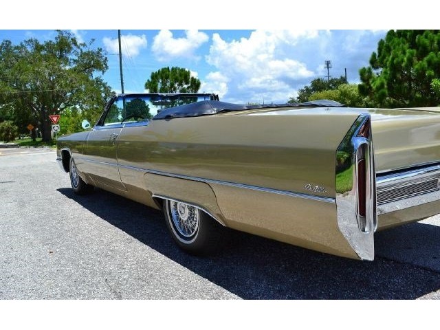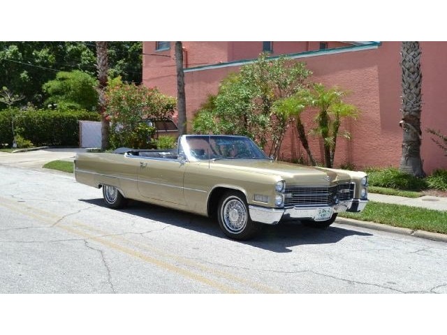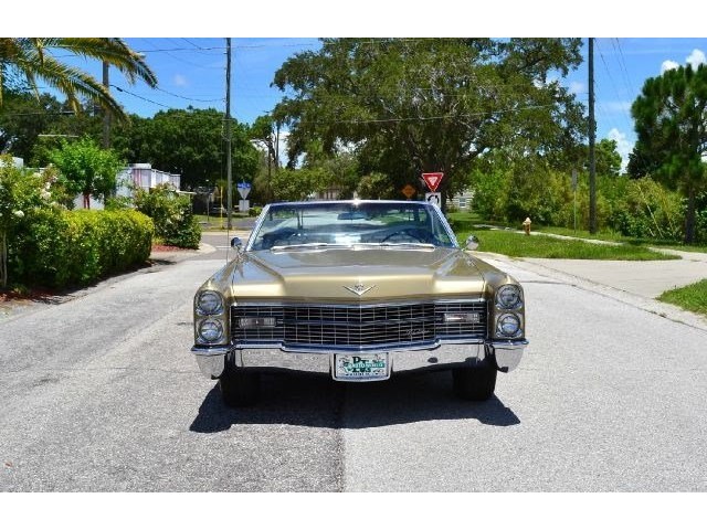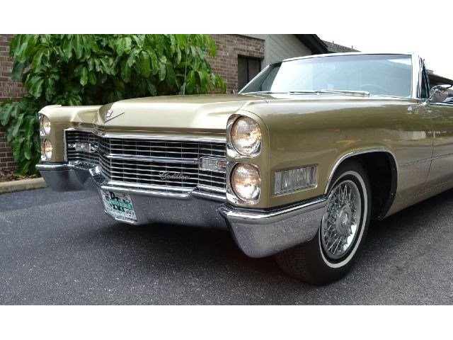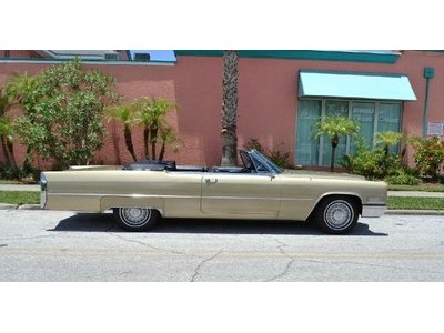 1966 Cadillac DeVille Convertible For Sale. 429 cubic inch V8 engine, automatic transmission, power steering, power brakes, factory steel wheels with BF Goodrich white line radial tires, code 44 antique gold exterior, black power convertible top with glass rear window, black convertible top boot, carpeted trunk, chrome driving mirrors with drivers remote option, power windows, power seat, leather upholstery with comfort weave inserts, auto dimming headlights, AM/FM radio. Ride in comfort, this 1966 Cadillac is ready for a cruise!!!