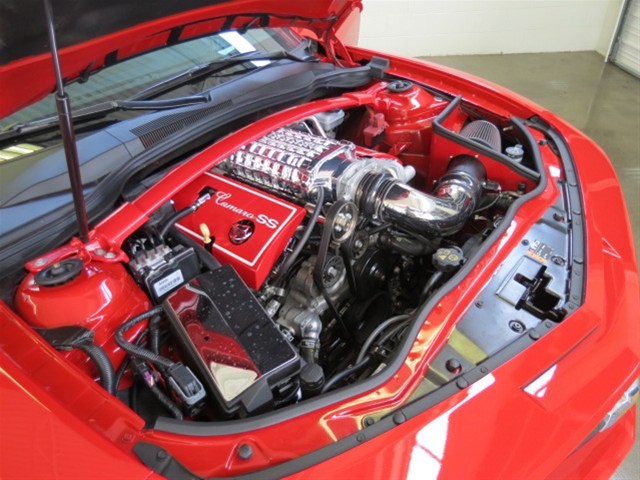The SS comes from the factory with 20" wheels, white stripes, and Hurst short throw shifter. Power is never lacking in the Camaro especially this one with the Magnuson Supercharger kit $9,850. The kit includes Polished TVS2300 roots hybrid Blower, injectors, Kenne Bell boost-a-pump, and SLP longtube headers (Headers, highflow cats, chrome intake, chrome valve covers) . The headers bolt directly into the factory exhaust for a sleeper finish. These upgrades add about 120HP over stock!