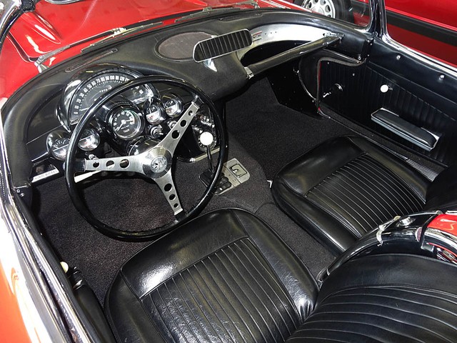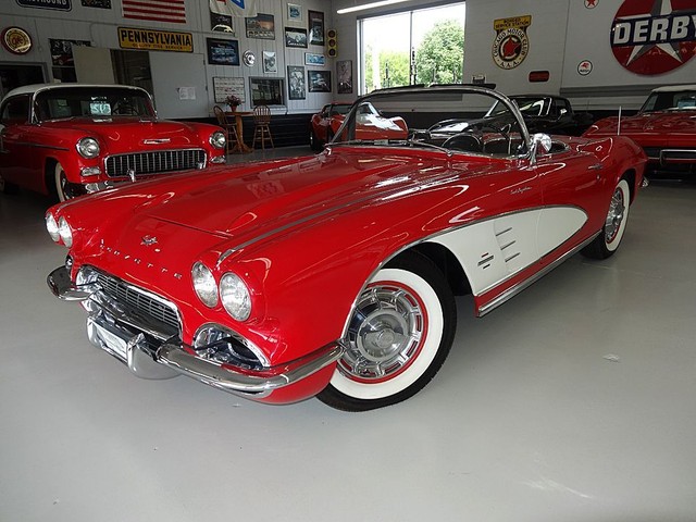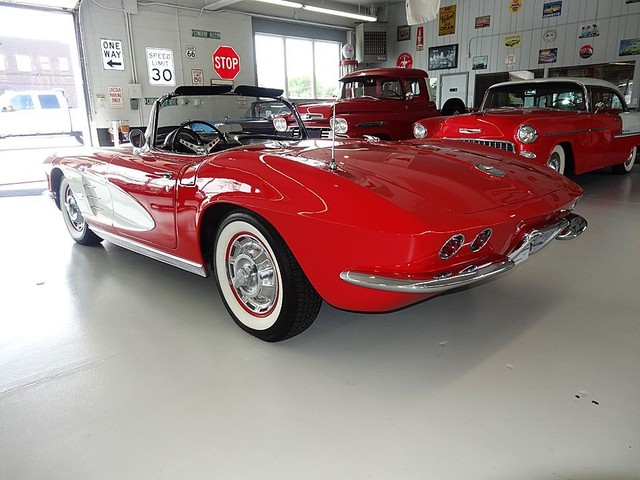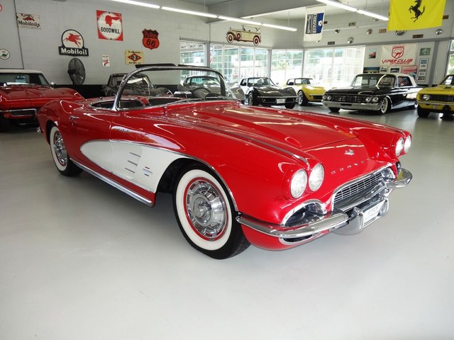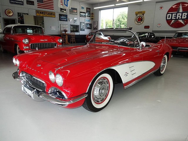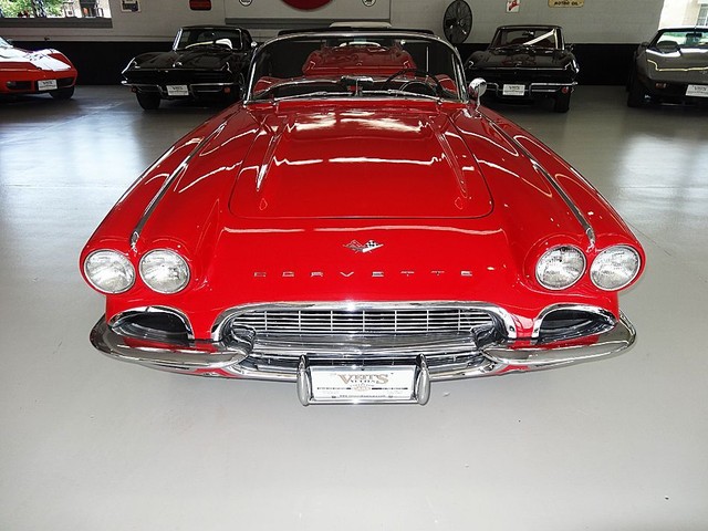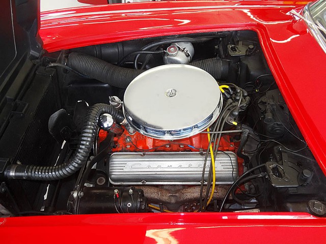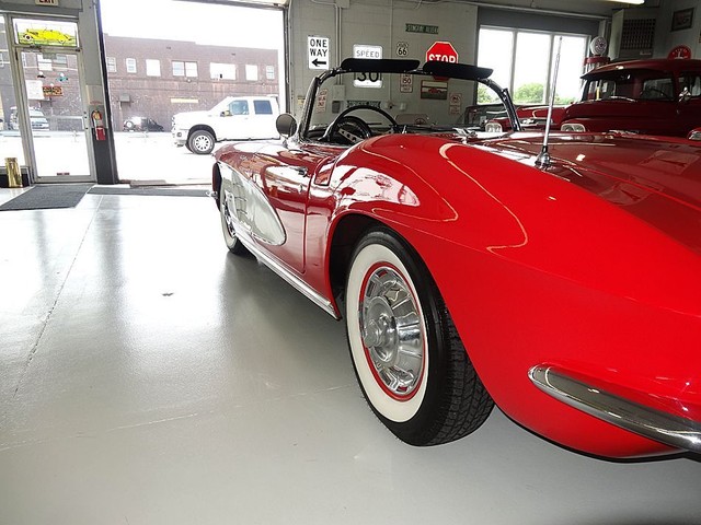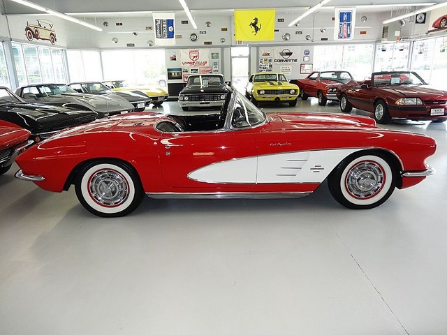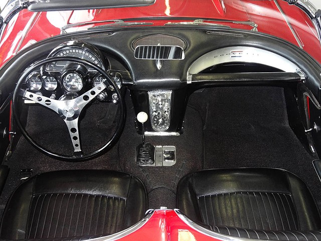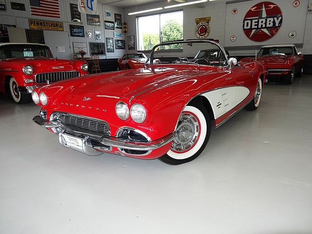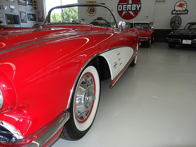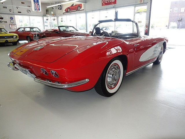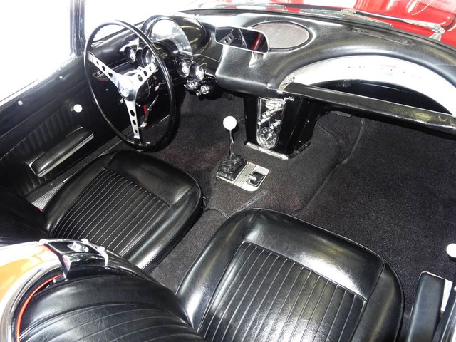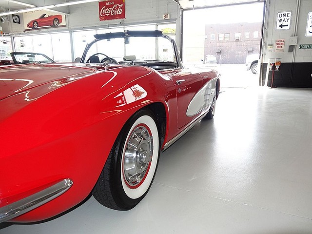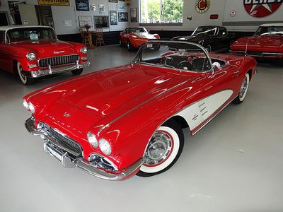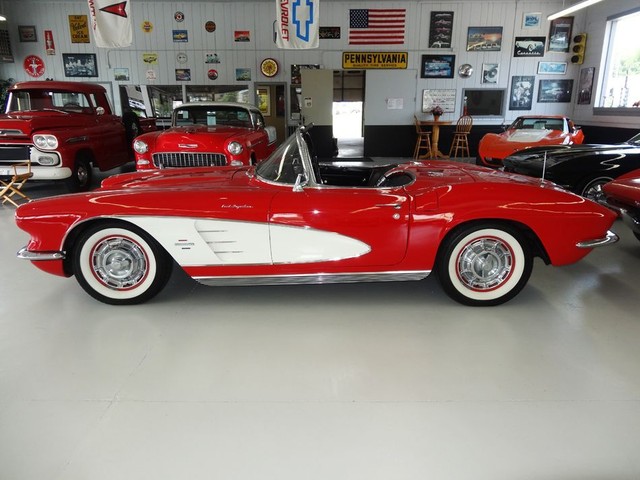 ‘61 Chevy Corvette Roadster, red with white coves, black top and interior. Features: Has Fuel Injected emblems, Engine rebuilt and switched to a 327-300HP V8. Repainted 4 years ago - All Good chrome with bumperettes, front and rear. Good glass, Correct air cleaner, 4 Speed w/Hurst shifter (original shifter comes with sale). Newer black top – has a couple very small tears from getting pintched probably from being installed/adjusted, very serviceable. Nice clear rear window. Newer Dual exhaust, Newer brakes – including master cylinder. Newer wide white wall radial tires and newer spare – in good condition. Newer hub caps – factory correct. Carpeted in trunk and  interior in good condition. Drivers side exterior mirror. Interior features: Black vinyl interior, with seat belts, heater, defroster, nice newer looking gauges – Lights, gauges, signals, horn - all working. Tach and Factory radio n/w. Owners manual, Some receipts, Runs real strong – just ran a 200 mile road trip. We sold this car to the man we bought it from, 5 years ago. He put only 1,000 miles on it… for health reasons, he was forced to sell it. THESE ARE SCARCE – BE READY FOR STARES. Showing 42,064 miles – believed to be actual.