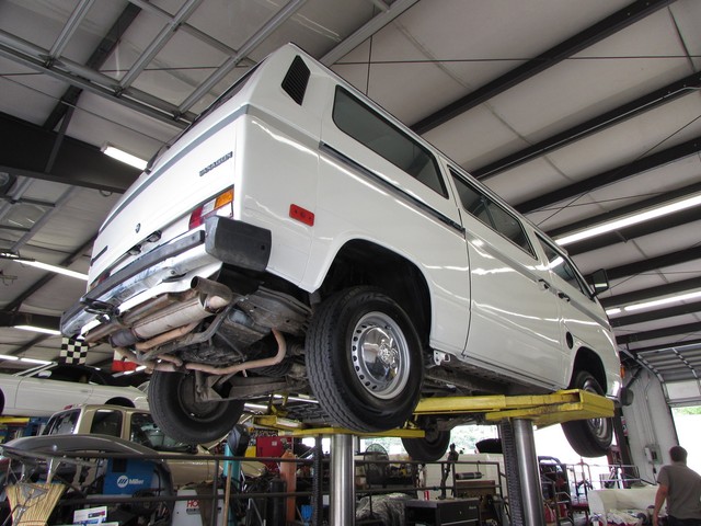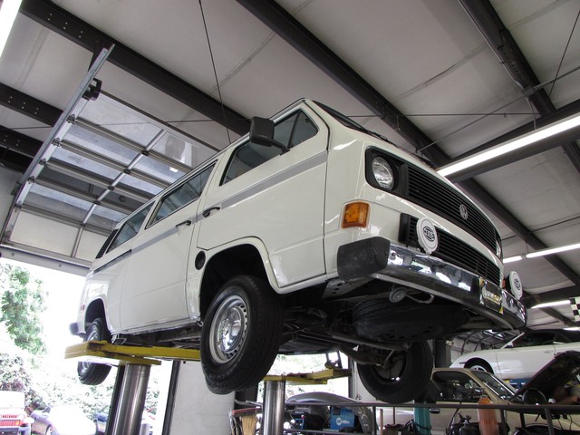 We purchased this bus in Washington state after it was donated to charity. It was supposed to be non-operational (assume needs engine) When it arrived, the pleasant surprise was that it was just out of gas. The engine actually ran fine! But the fuel pump was on its way out, so for the first round of service we changed the fuel pump & filter, oil & oil filter, spark plugs, wires, and drive belt. Then the van was driven for a few days to confirm that it was as good as it seemed. The second round of service included new front brakes - rotors & pads, and 5 new LT rated tires. With this done, the van ran and drove great. The original paint was ok, but the van really needed to look fresher so it has received an all over paint job and some new trim. We finished it off by totally renewing the driver seat, replacing the stereo and adding rubber floor mats and some Hella 500 fog lights. The headlights are new too.) The end result is a Vanagon that is good looking, useful and fun.