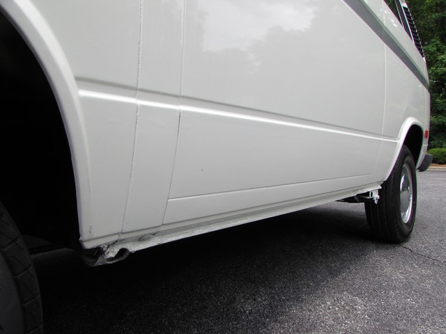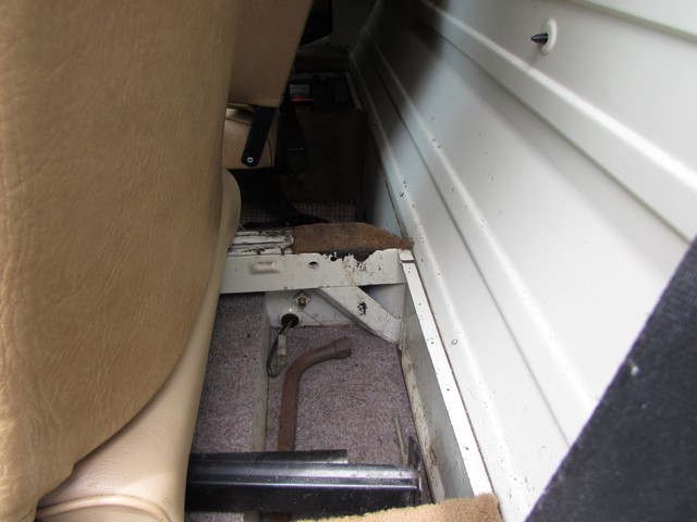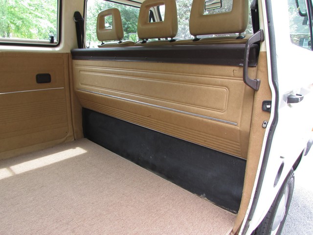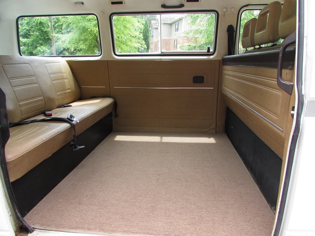 Being a west coast van, it is very solid with no rust issues. The paint was 100% original when we got the van, so beyond a few dents & dings there was no evidence of any accident damage or body repairs. The interior is not all original. The carpet in the cab had been changed already and was low quality, so we replaced it with good tan carpet from another van, then added rubber mats from GoWesty. The driver seat was worn and torn so it has been replaced and recovered in new tan vinyl. It looks good and is very comfortable. The radio was an '80's tape deck that actually worked but modern CD stereos are not expensive so we replaced it. We added the cupholder for both convenience and to cover up the hole where the CB radio mike was located. In the back, the middle seat has been removed and plywood covered in tan carpet put in its place. This must have been done not long before the van was donated as it is clean and looks ok. For the buyer who really wants a middle seat, no problem we have several extras. The previous owner has installed an extra light above the sliding door. It's a Hella light, very bright and actually very useful - probably installed for camping.