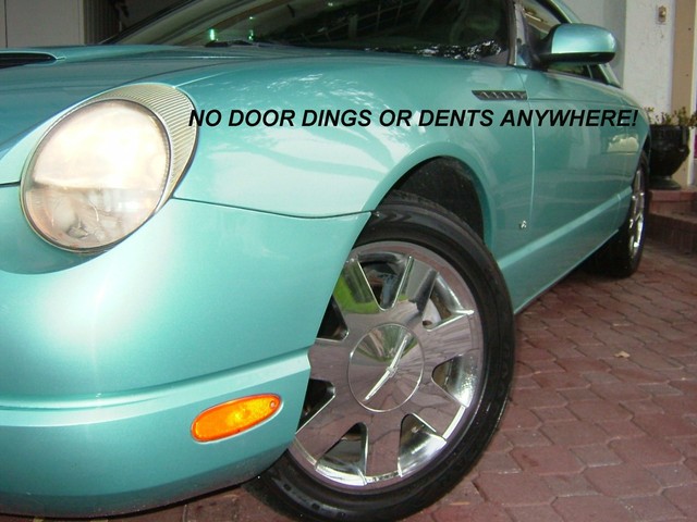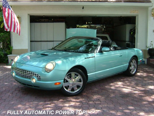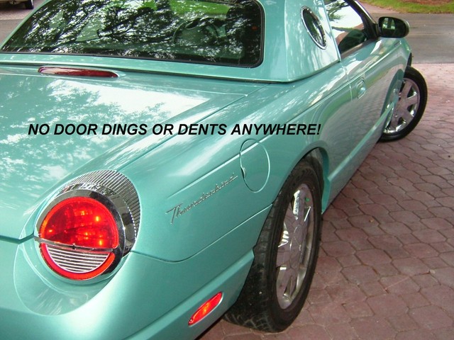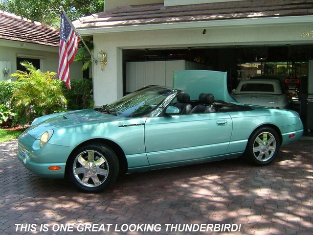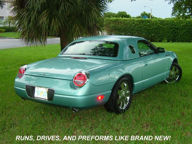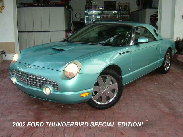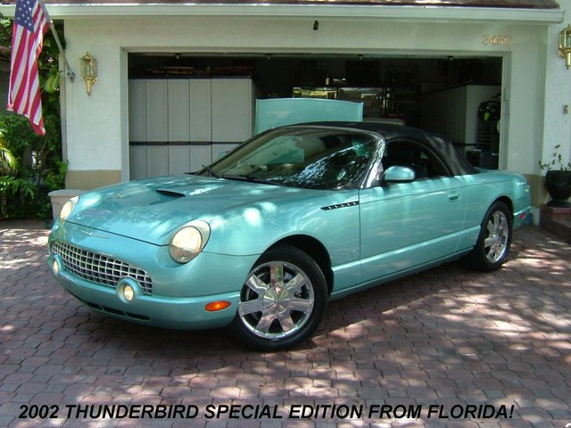 THIS 2002 FORD THUNDERBIRD LIMITED EDITION IS THUNDERBIRD BLUE WITH A TWO TONE THUNDERBIRD BLUE AND BLACK LEATHER INTERIOR! TOTALLY RUST FREE, GARAGE KEPT T-BIRD! THIS SPECIAL EDITION IS THE BEST COLOR OF THUNDERBIRD BLUE! IT RUNS, DRIVES AND PREFORMS ABSOLUTELY LIKE BRAND NEW! THE ALL ORIGINAL PAINT HAS NO DENTS, DINGS, OR SCRATCHES ANYWHERE! THE TWO TONE LEATHER INTERIOR IS LIKE NEW. THE ORIGINAL BLACK CANVAS CONVERTIBLE TOP IS PERFECT! THE MATCHING REMOVABLE HARDTOP COMES WITH THE OPTIONAL CARRIER ON WHEELS FOR EASY STORAGE FROM FORD. IT HAS THE ORIGINAL BLACK CONVERTIBLE TOP BOOT. LOADED WITH ALL THE OPTIONS INCLUDING POWER EVERYTHING, CRUISE, POWER TOP, CD PLAYER, CHROME FACTORY ALLOY WHEELS AND LIKE NEW GOODYEAR GT RADIAL TIRES, EXTRA OPTION CHROME TAIL LIGHT BEZELS, DUEL EXHAUSTS, AND PREMIUM EDITION FOG LAMPS! IT'S THE MOST ORIGINAL AND STRAIGHTEST RETRO BIRD YOU COULD FINE WITH THE NUMBER 1 COLOR COMBO! VERY IMPORTANT THINGS TO LOOK FOR AND ASK QUESTIONS ABOUT ON THESE T-BIRDS IS HOW IS THE CHROME AROUND THE WINDSIELD? THEY TEND TO START PEELING. THIS ONE IS PERFECT! ANY PITS ON THE FRONT CHROME GRILL? THIS ONE IS PERFECT! ANY PITS OR CORROSION ON THE CHROME WHEELS? THESE ARE PERFECT! ANY FLAWS AROUND THE REAR WINDOW ON THE CONVERTIBLE ROOF? THIS ONE IS PERFECT!  AFTER A VERY CLOSE INSPECTION MECHANICALY AND OSMETIC WISE THE ONLY FAULT WE COULD FIND WAS SOME SLIGHT PAINT CHIPING ON THE LOWER FRONT NOSE THAT WAS PROBABLY FROM TOUCHING THE GARAGE WALL. IT HAS A NEW KENWOOD STEREO AND CD PLAYER THAT I HAVE NO IDEA HOW TO POWER UP. (FUSE?) (IF NOT JUST SIDE IT OUT AND INSTALL A NEW ONE) OTHER THAN THAT IT IS PERFECT AND NEW! AVERAGE RETAIL VALUE IS $17,950.00. THIS IS NOT YOUR AVERAGE THUNDERBIRD. HOWEVER THE "BUY IT NOW" PRICE IS LESS! THIS IS A 5 DAY AUCTION AND THE RESERVE PRICE IS SUPER LOW. WANT TO MAKE A REASONABLE OFFR AND "BUY IT NOW"? JUST GIVE ME A CALL ANYTIME AT 954-695-1001. ANY QUESTIONS? JUST CALL ME! HAPPY TO ANSWER ANY QUESTIONS YOU MAY HAVE ON THIS FINE AUTOMOBILE! THANKS, JAY.